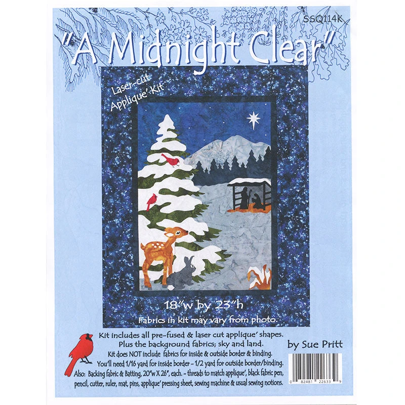 A special wintry night is brought to life in this precut prefused appliqué quilt by Sue Pritt. A curious deer and red cardinals peer in on a Christmas manger scene set in a snowy forest clearing.