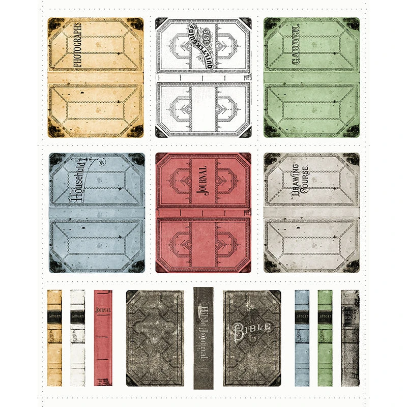 Panel of vintage book covers on a white background. If you have always loved putting pen to paper, the Art Journal fabric line is for you! Designed by J. Wecker Frisch for Riley Blake Designs, this collection features a wide variety of text prints (from handwritten notes to sheet music), plus nature sketches and flowers to tie it all together. This soft color palette pairs pastels and whites with a few contrasting black prints to help you express your creativity!
