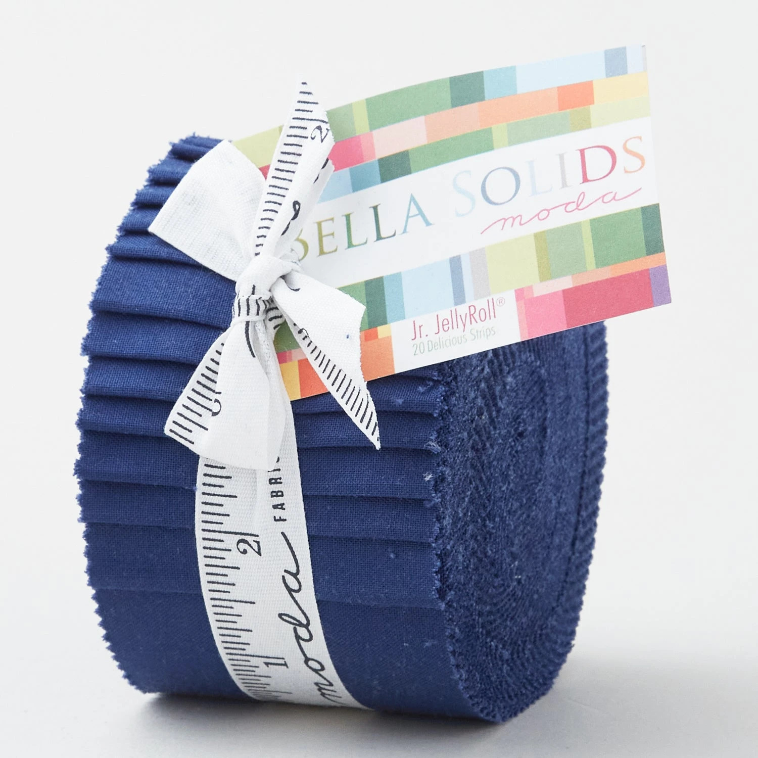 Junior jelly roll of Bella solid blue 2-½” strips. Solids are fantastic because of the balance they bring to quilts! If you need to balance out your project, consider Bella solids from Moda Fabrics! When it comes to Bella, you’ll always find the color you need, whether it’s sangria pink or lemon yellow.