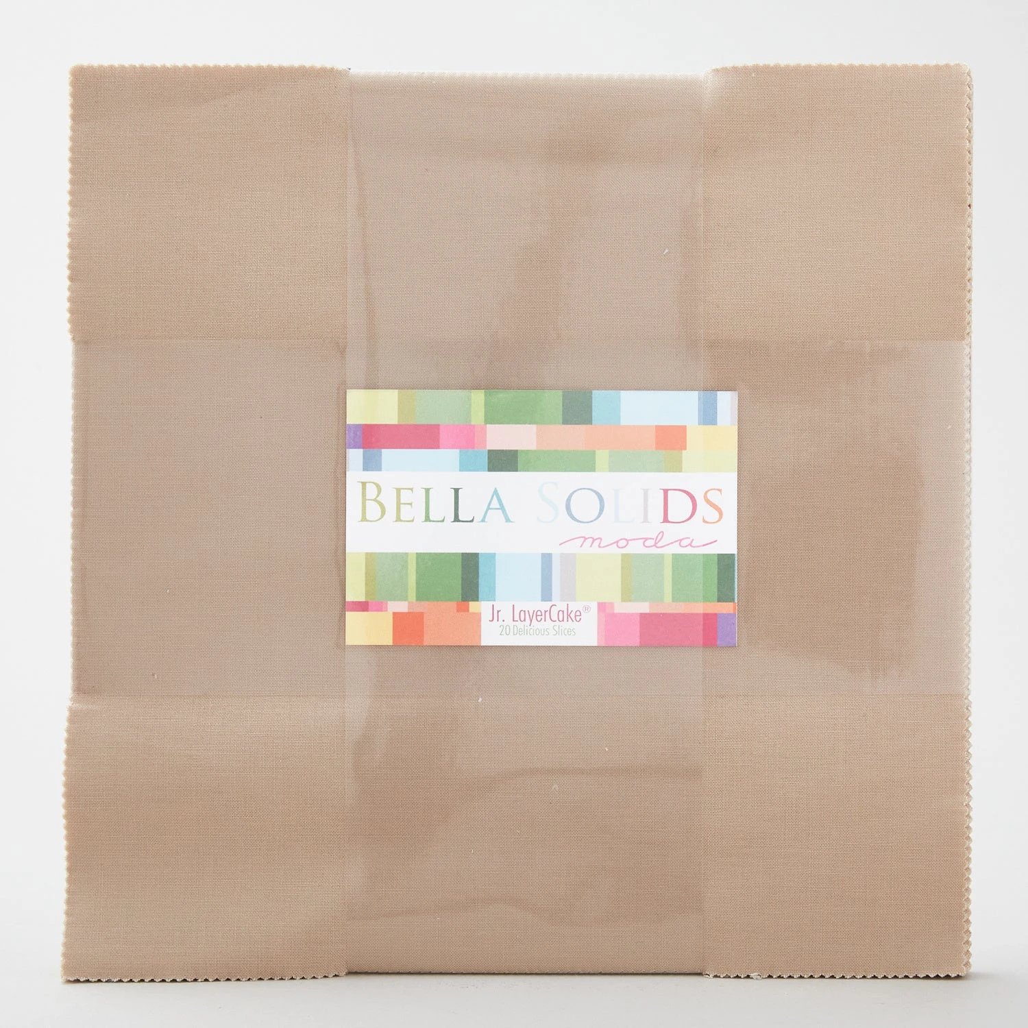 Junior layer cake of Bella solid tan 10” squares. Solids are fantastic because of the balance they bring to quilts! If you need to balance out your project, consider Bella solids from Moda Fabrics! When it comes to Bella, you’ll always find the color you need, whether it’s sangria pink or lemon yellow.