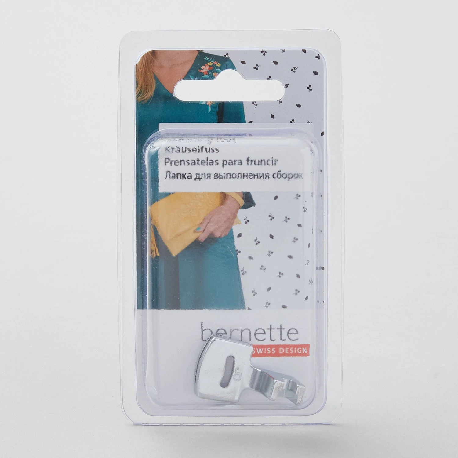 Gather ‘round! With the Bernette Gathering Foot, you can easily gather fabric for ruffles. Because the sole of this foot does not lie flat on the feed dog, the foot feeds the fabric unevenly to create a charming gathering effect. Fits Bernette models b79/b77.