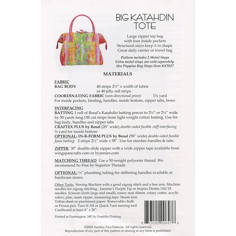 Choose a favorite 2 1/2″ strip roll to create this large zipper top bag with four inside pockets. Structural stays help to keep its shape. Pattern has easy-to-follow directions and 2 pre-bent stays. Recommends Bosal Katahdin Precut 2 1/2″ batting and Bosal Craf-Tex Plus. Additional structural stays sold separately.