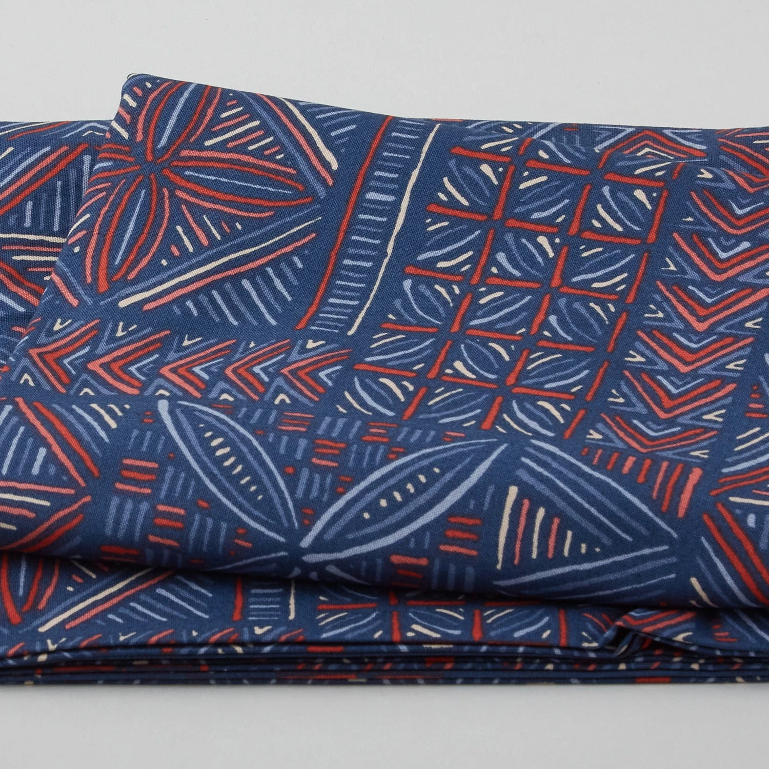 A 2 yard cut of red, white, and blue geometric patterns on a blue background. Make waves this summer with these bright fabrics! Breezeway by Maywood Studio is a fun fabric collection perfect for any summertime project. This collection features arrows, stripes, geometric patterns, and more. Pair these fabrics with your favorite coordinating solids to make these patterns pop!