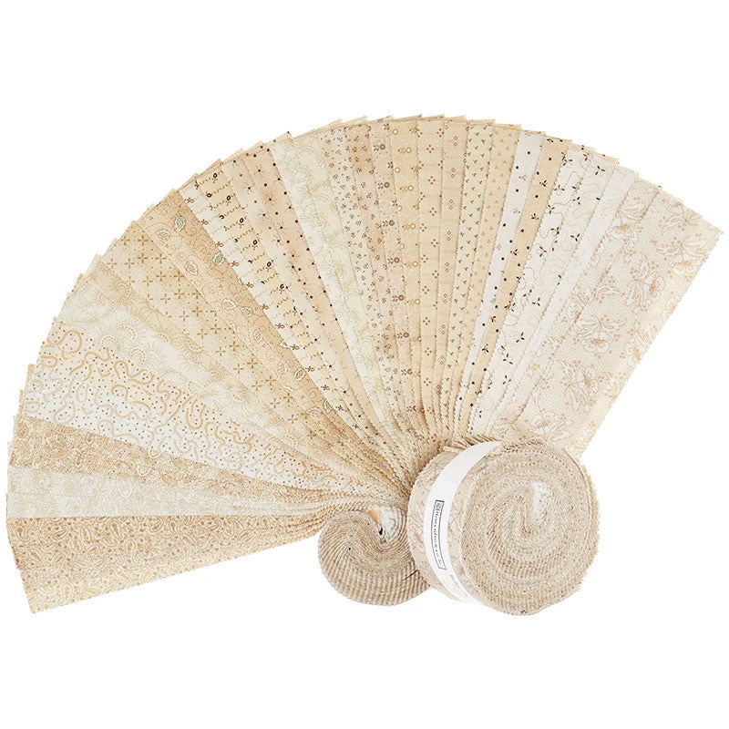 Get back to basics with this 2.5” strip pack! Just like soul food needs butter, your next project needs these rich fabrics! From creamy beiges to buttery browns, this collection features a slew of simple yet elegant traditional floral and paisley patterns that are filled with rustic charm.