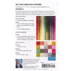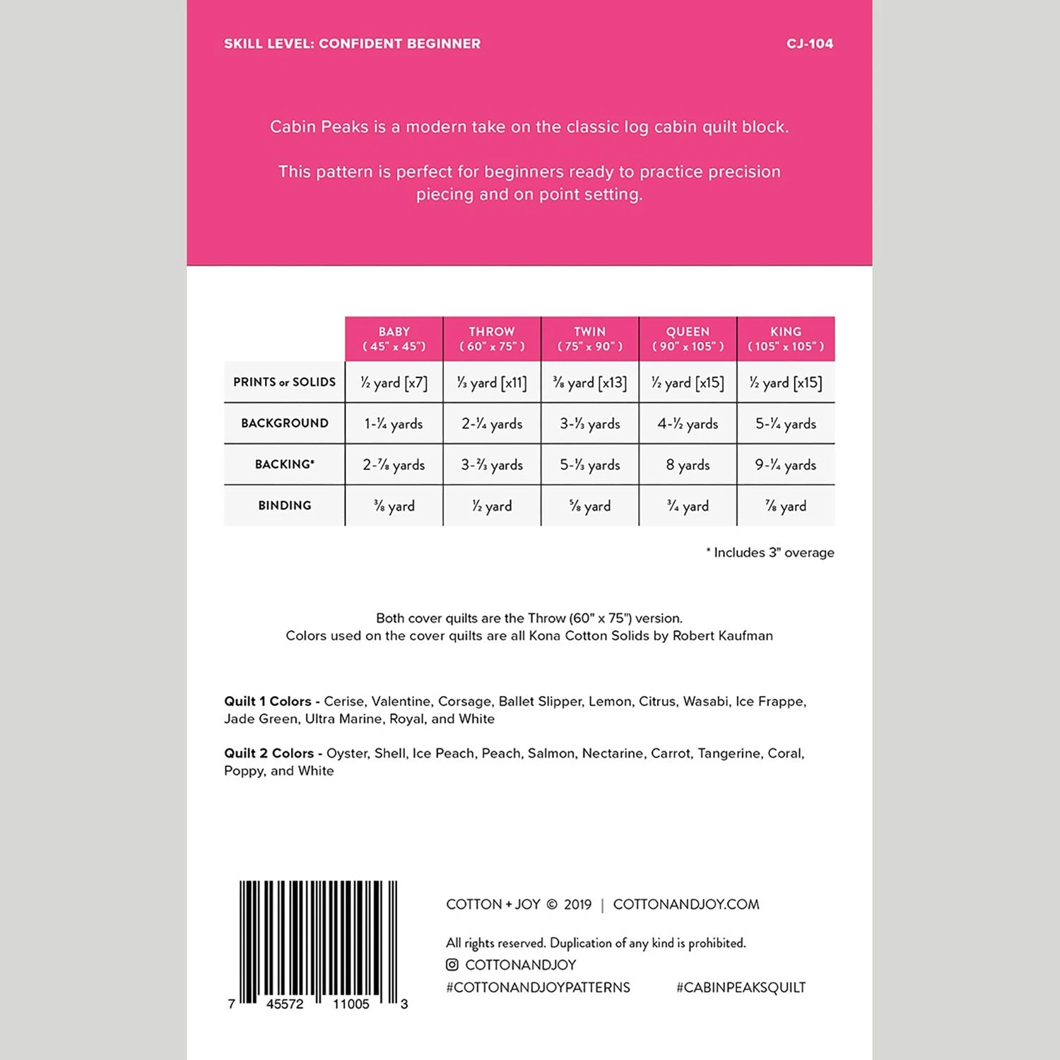 Cabin Peaks takes the classic Log Cabin quilt block and turns it on its side! This modern pattern from Cotton and Joy is perfect for confident beginners who are ready to practice precision piecing and on-point setting. Pattern includes helpful diagrams, detailed instructions, and a Color-Your-Own page to help you decide your fabric choices. The cover quilts were made using Kona Cotton Solids by Robert Kaufman.