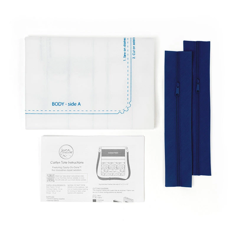 Sew a Caitlyn Crossbody Tote Bag with this kit from June Tailor! This slim crossbody purse is designed to take your essentials with you anywhere and features a large exterior zipper pocket and a small interior pocket. Kit includes printed utility fabric for one tote, instructions, and two Zippity-Do-Done™ pre-sewn zippers in navy. You get to supply your own fabrics for the perfect touch!