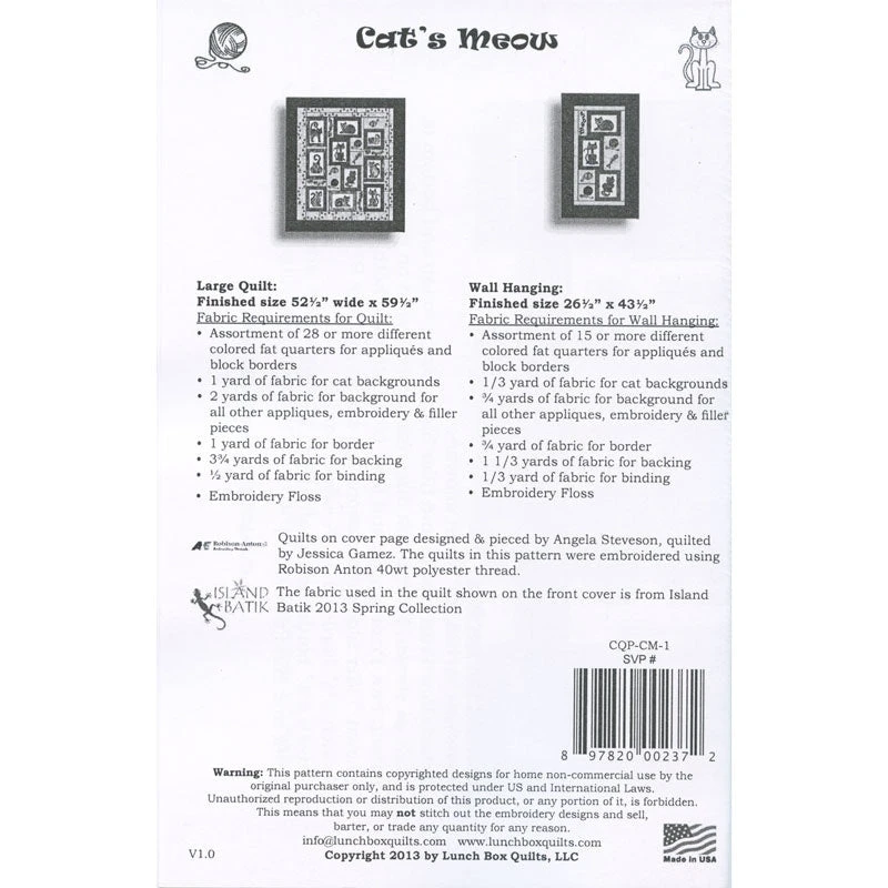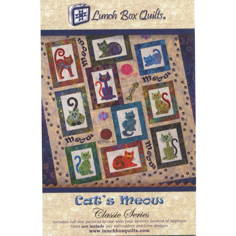 Cats, cats and more cats! Whether you are a cat lover or know someone that loves cats, this quilt pattern is a must have. Seven adorable embroidery appliqué cats and five additional cat related designs complete this collection. Pattern, designed by Angie Stevenson of Lunch Box quilts includes directions and appliqué cats. Excellent companion quilt to Mixed Mutts.