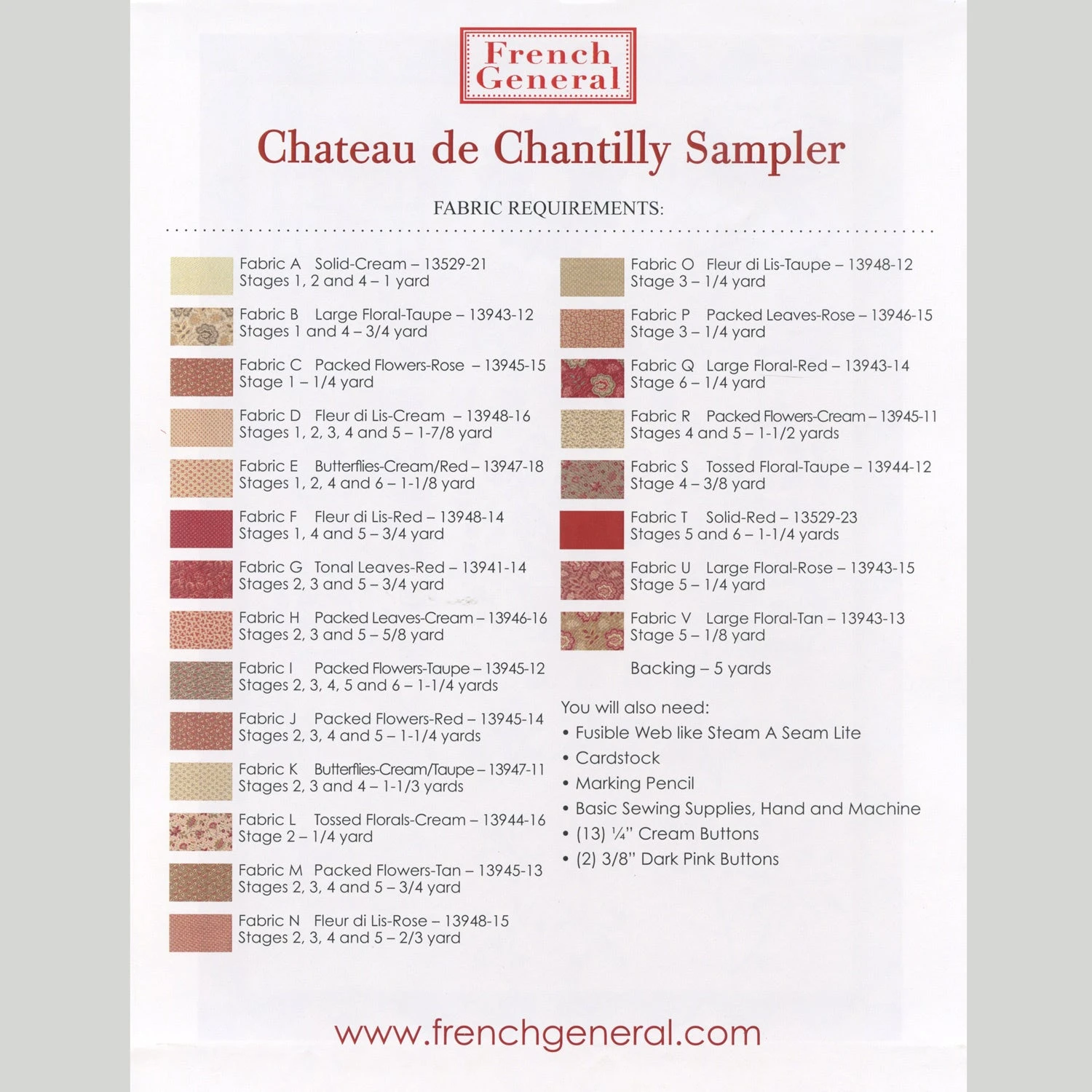 Classic and stunning! This sampler pattern, by Kaari Meng of French General, has directions for the appliquéd and pieced quilt featuring French General’s Chateau de Chantilly fabric collection for Moda. The quilt has a finished size of 56″ x 80″.