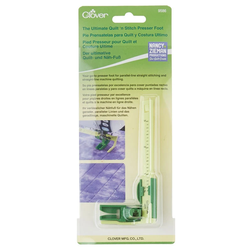 Easily stitch multiple rows of stitching without marking every time. Presser foot for parallel-line straight stitching and straight-line machine quilting featuring a built-in stitch alignment ruler for guiding rows of parallel stitching.