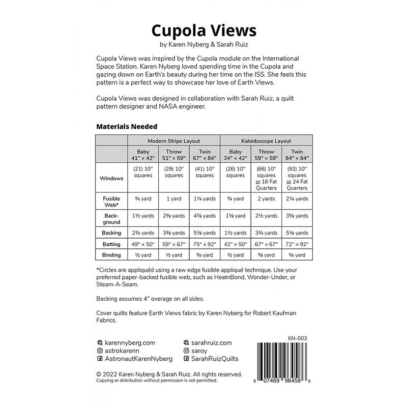 Inspired by the cupola views while on the international space station. Karen Nyberg, astronaut and quilt designer,, developed this design with spectacular earth views in mind. Pattern booklet has instructions for the pieced hexagon quilt in two layouts and 3 sizes in each layout.