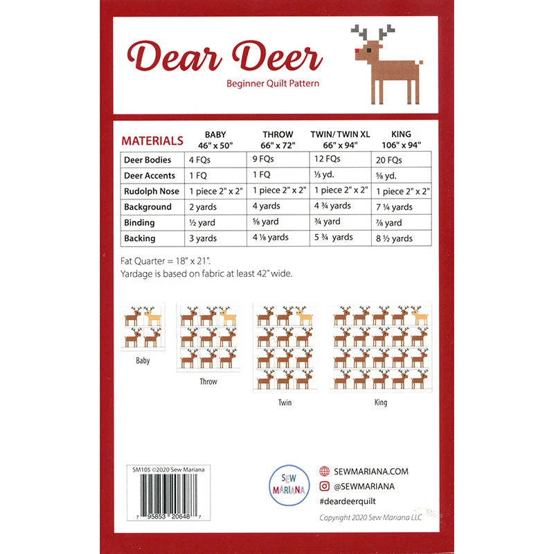 Dear Deer is a beginner friendly, big block pattern with only straight lines. It’s just the pattern to start the holidays! Count off all nine reindeer on this sweet winter quilt. This fat quarter friendly pattern comes with instructions to make four sizes. The directions include cutting diagrams, charts, full color graphics and clear step-by-step instructions that make it easy to follow along.