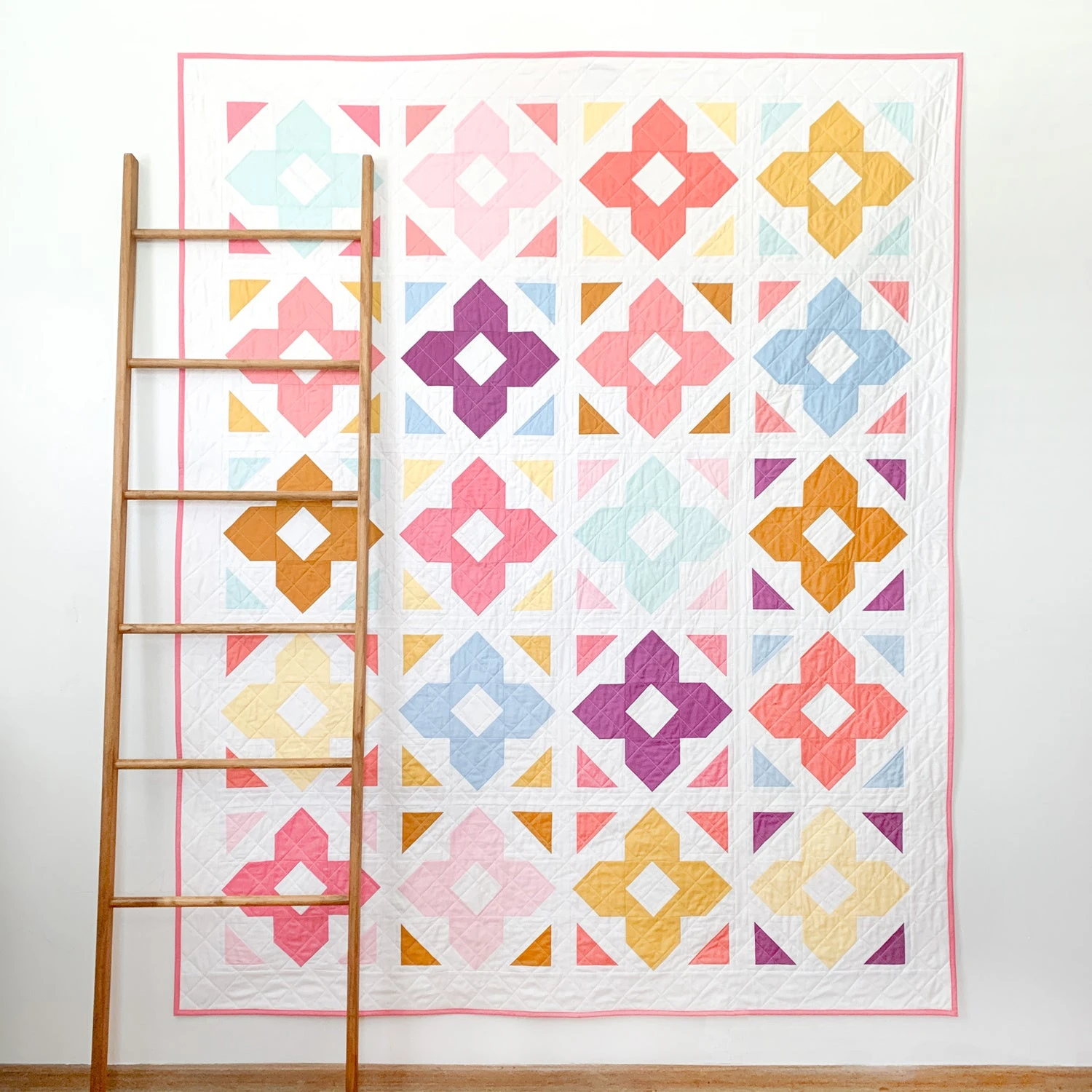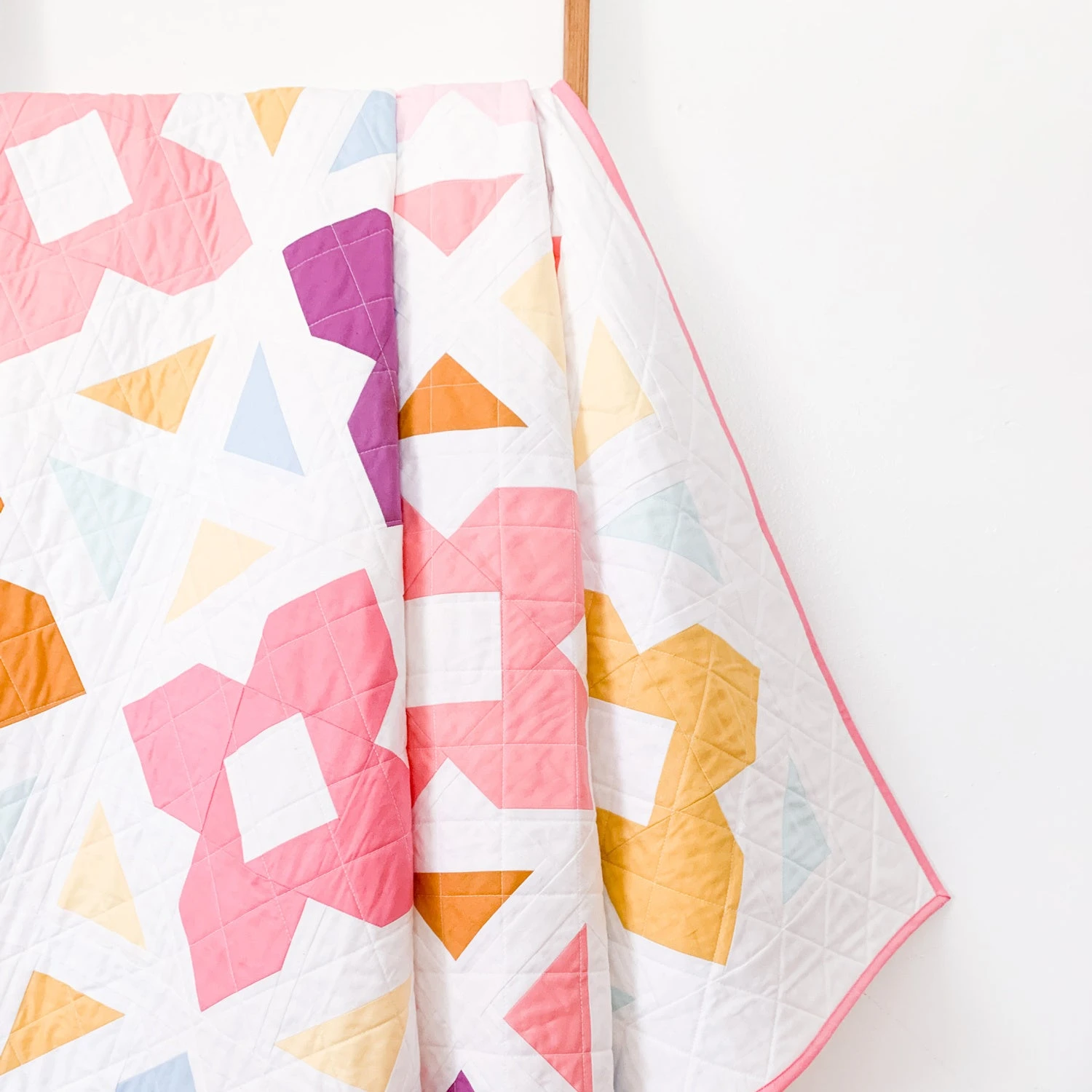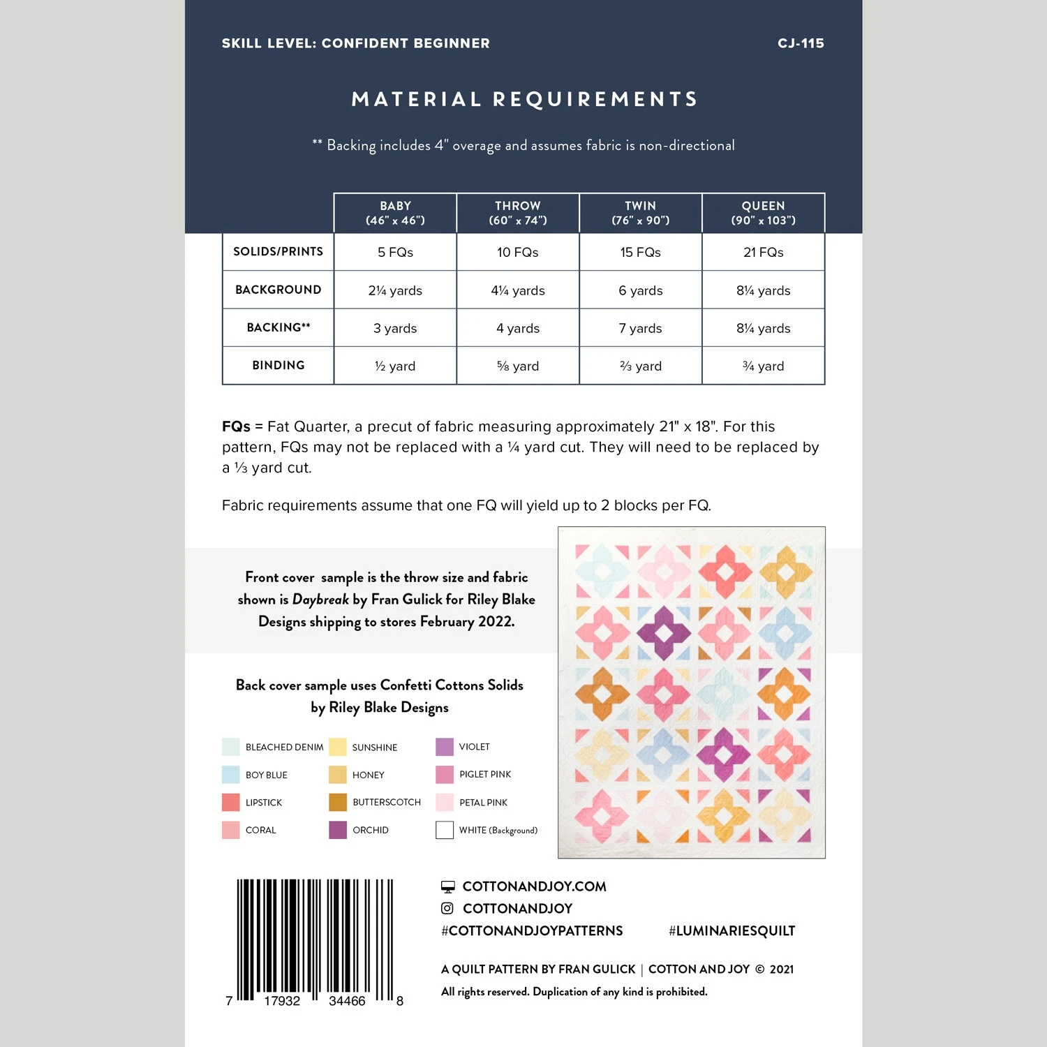 This quilt will light up a room! The geometric design of Luminaries shines, particularly when the quilt is made with solid colors. It is a fun mix-and-match pattern, great for the confident beginner. This block-based pattern from Cotton and Joy is fat-quarter-friendly and the perfect pattern to try whether your tastes are traditional, modern, or somewhere in between. Pattern includes helpful diagrams and detailed instructions.