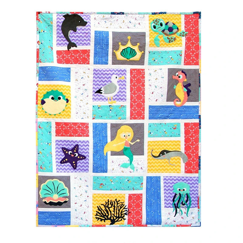 Sew a lovely geometric quilt embellished with adorable sea-inspired designs! The pattern has 12 appliqués including a dolphin, crown, sea turtle, pufferfish, seagull, seahorse, starfish, mermaid, stingray, an oyster with a pearl, coral, and a jellyfish. With this quilt-as-you-go project, the quilting and piecing is done in one step! Simply attach a backing using your desired method and get ready to snuggle.