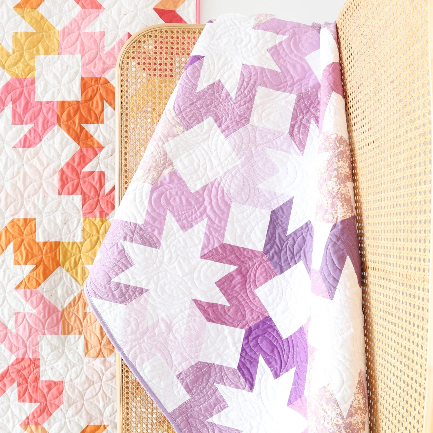 Starlight, star bright! Your wish for a beginner-friendly and precut-friendly quilt pattern just came true! The Starlight quilt pattern from Cotton and Joy is a modern sawtooth star pattern, made up of a mix-and-match design. You can use your favorite fat-quarter bundle or 10” squares. The pattern includes helpful diagrams, detailed instructions, and a Color-Your-Own page to help you decide on fabric choices. The sample quilt was made using Confetti Cotton Solids by Riley Blake Designs.