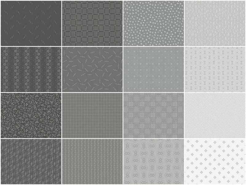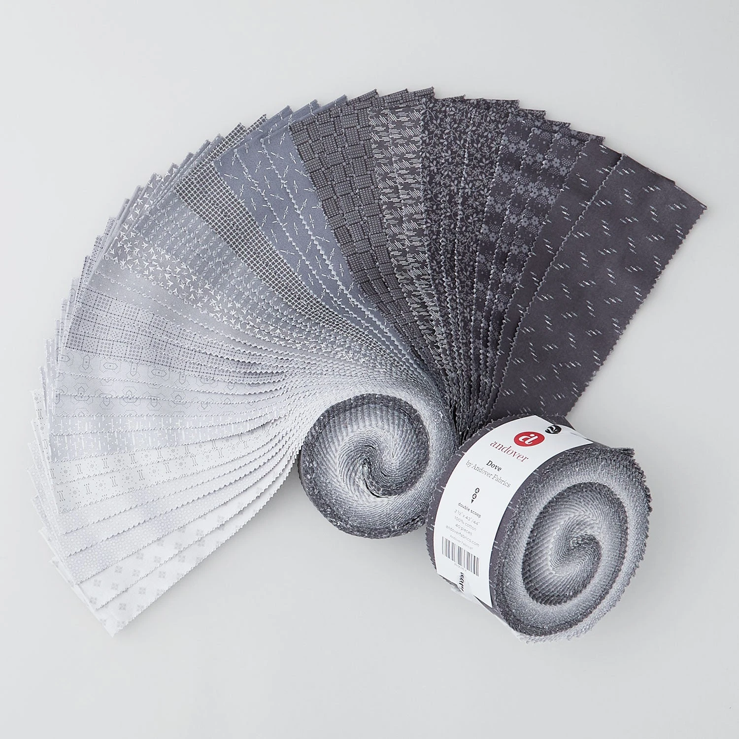 A Double Scoops (2.5″ Strips) Bundle of assorted grey blender prints. The Dove collection from Andover Fabrics features tiny flowers, checks, dots, and other geometric patterns in shades of grey. These prints will add a peaceful place for your eyes to rest on any quilt top!