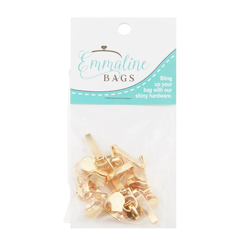 Zippers for every occasion! A pack of 10 #3 gold zipper sliders and pulls. These are designed for the Emmaline #3 Zipper-by-the-Yard zippers.