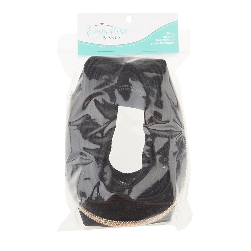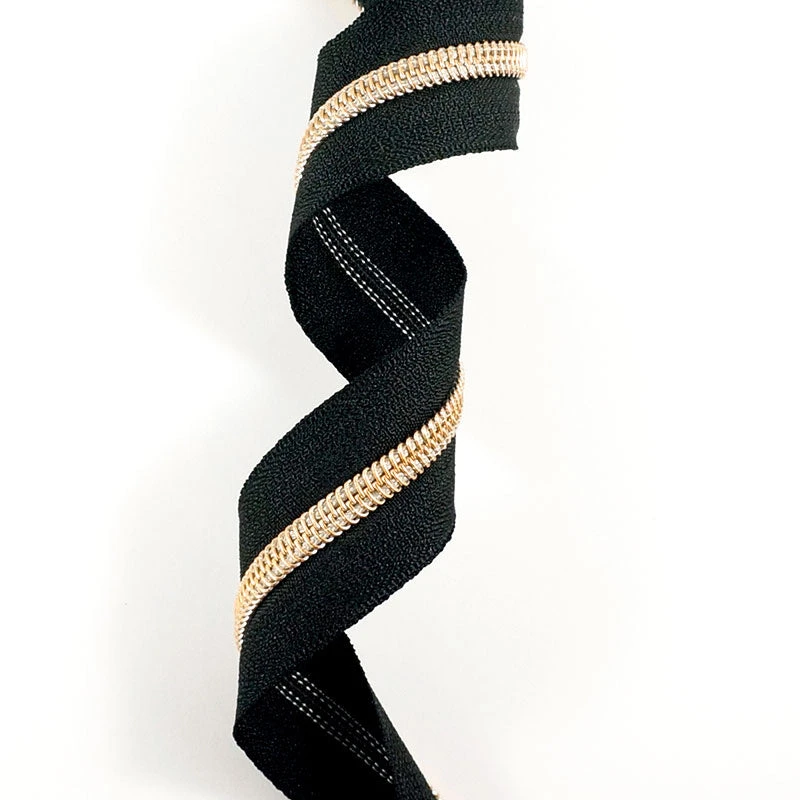 3-yard roll of a black nylon and copper zipper. The #5 nylon coil zippers from Emmaline Bags are perfect for areas where you want a heavier zipper, such as bag openings or side pockets. Tip: you can make double zippers by adding two zipper pulls in either direction! #5 Zipper sliders and pulls sold separately.