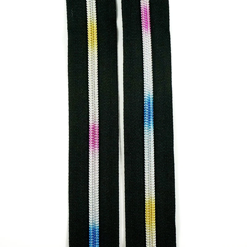3-yard roll of a black nylon and rainbow zipper. The #5 nylon coil zippers from Emmaline Bags are perfect for areas where you want a heavier zipper, such as bag openings or side pockets. Tip: you can make double zippers by adding two zipper pulls in either direction! #5 Zipper sliders and pulls sold separately.