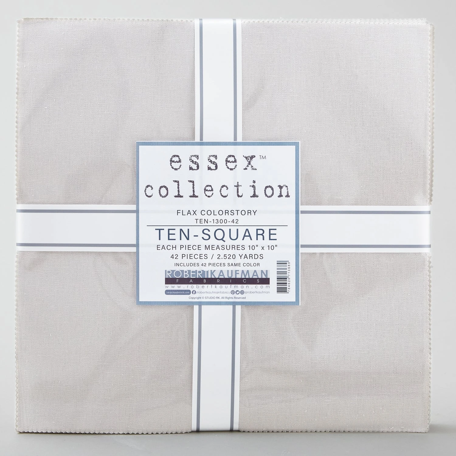 A pack of 10″, solid flax, linen squares. Essex Solids from Robert Kaufman provide the staple colors you need along with quality you can trust. Browse through these solids to find just the right color for a particular project, or stock up on several to have on hand for when inspiration strikes!