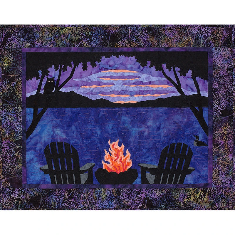 The fire is blazing and the sky is too. Kit, designed by Sue Pritt, includes the pattern and batik fabrics for the background and precut fusible appliqué shapes. You supply the inside and outside border fabrics, binding and backing.