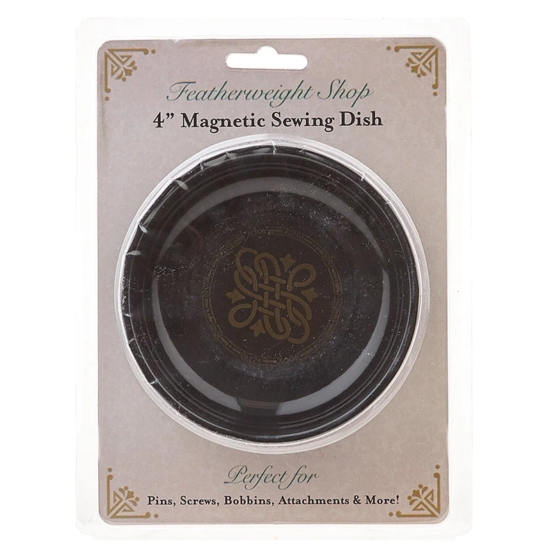 Magnetic pin dish are designed with the original black and gold decals from the Singer Featherweight 221 sewing machines.
