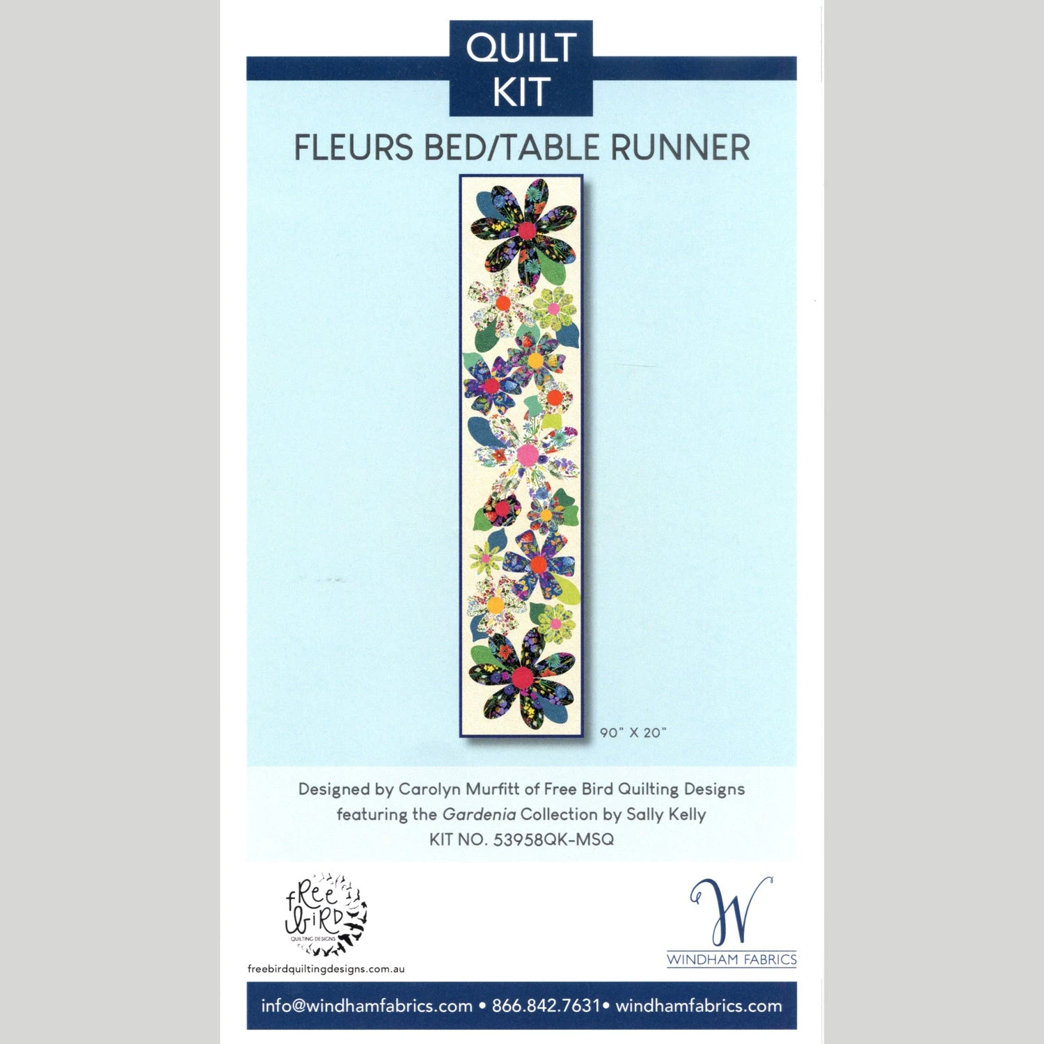 Designed by Free Bird Quilting Designs, this applique quilt kit contains a pattern and Gardenia fabrics by Sally Kelly for Windham Fabrics for the top and binding in a collector box.