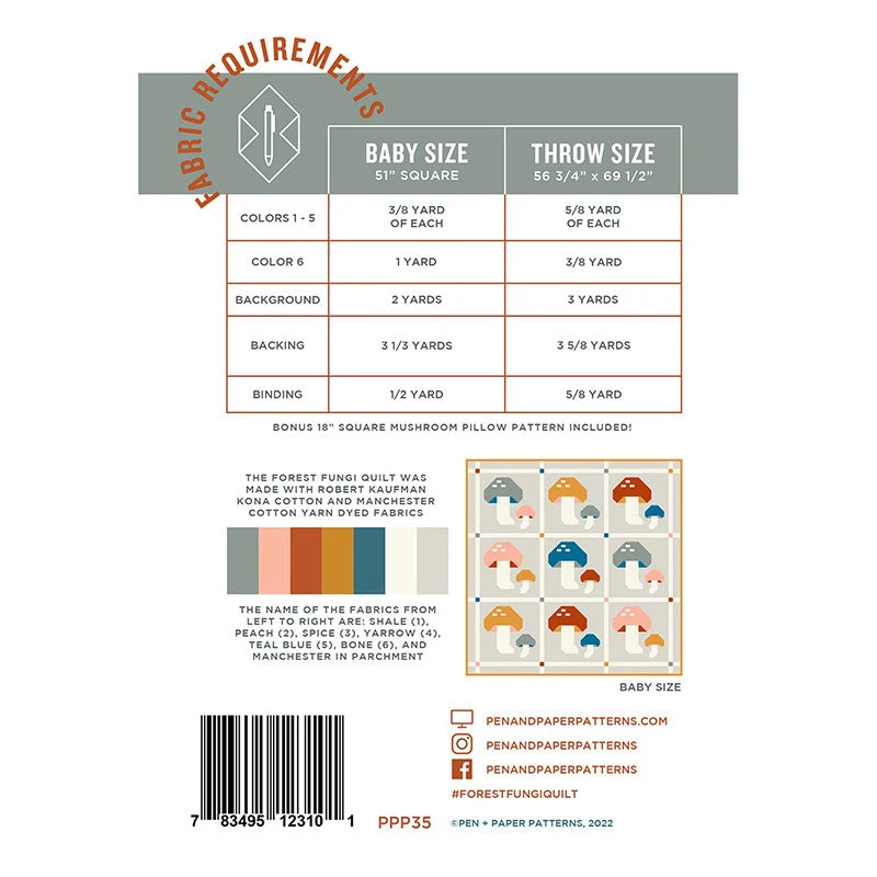 Forest Fungi by Pen + Paper Patterns is a beautiful woodland inspired, traditionally pieced quilt that can be made in two sizes: Baby and Throw. This pattern also includes bonus instructions for making an 18″ square zippered pillow using the mushroom block as well.