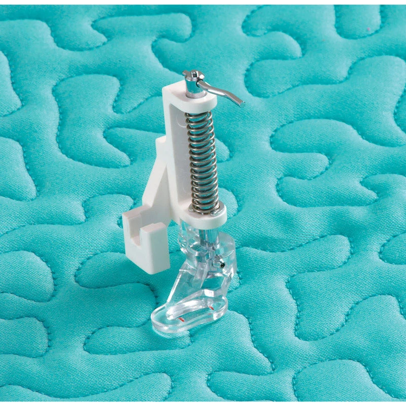 This clear-view foot offers excellent visibility and control. The spring load will prevent flagging and help keep fabric flat and under control. Great for performing stippling, meandering and thread painting techniques simply and precisely.