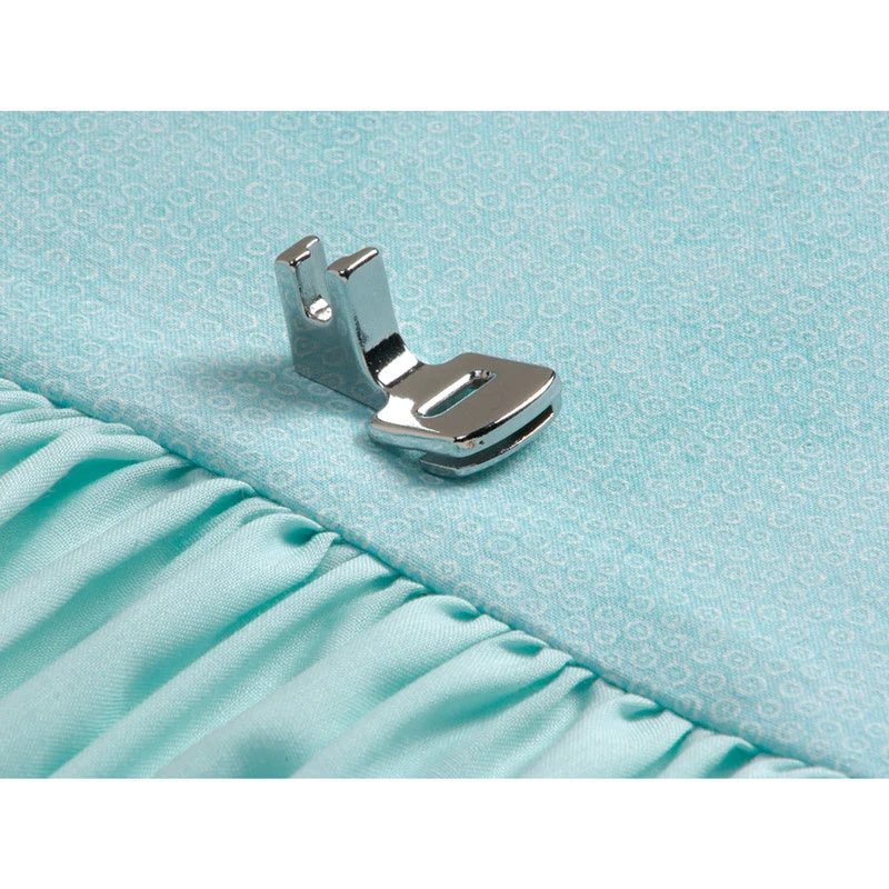 Gather the fast and easy way with this foot. The gathering foot simultaneously gathers and attaches ruffles to garments, pillow and other home decor items in no time!