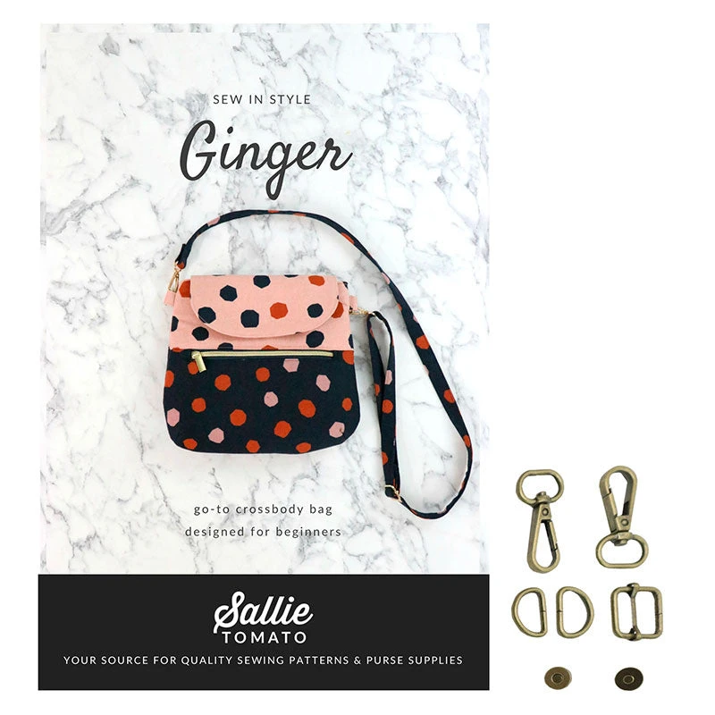 This oh-sew-trendy Ginger Crossbody bag from Sallie Tomato is a fast sew project designed for beginners! This bag and hardware bundle includes the Ginger Crossbody pattern and the Sallie Tomato Level 4 Basic Hardware Kit. Pattern includes step-by-step instructions for a medium-sized bag and features an exterior zipper pocket, interior pocket, flap closure, and an adjustable crossbody strap.