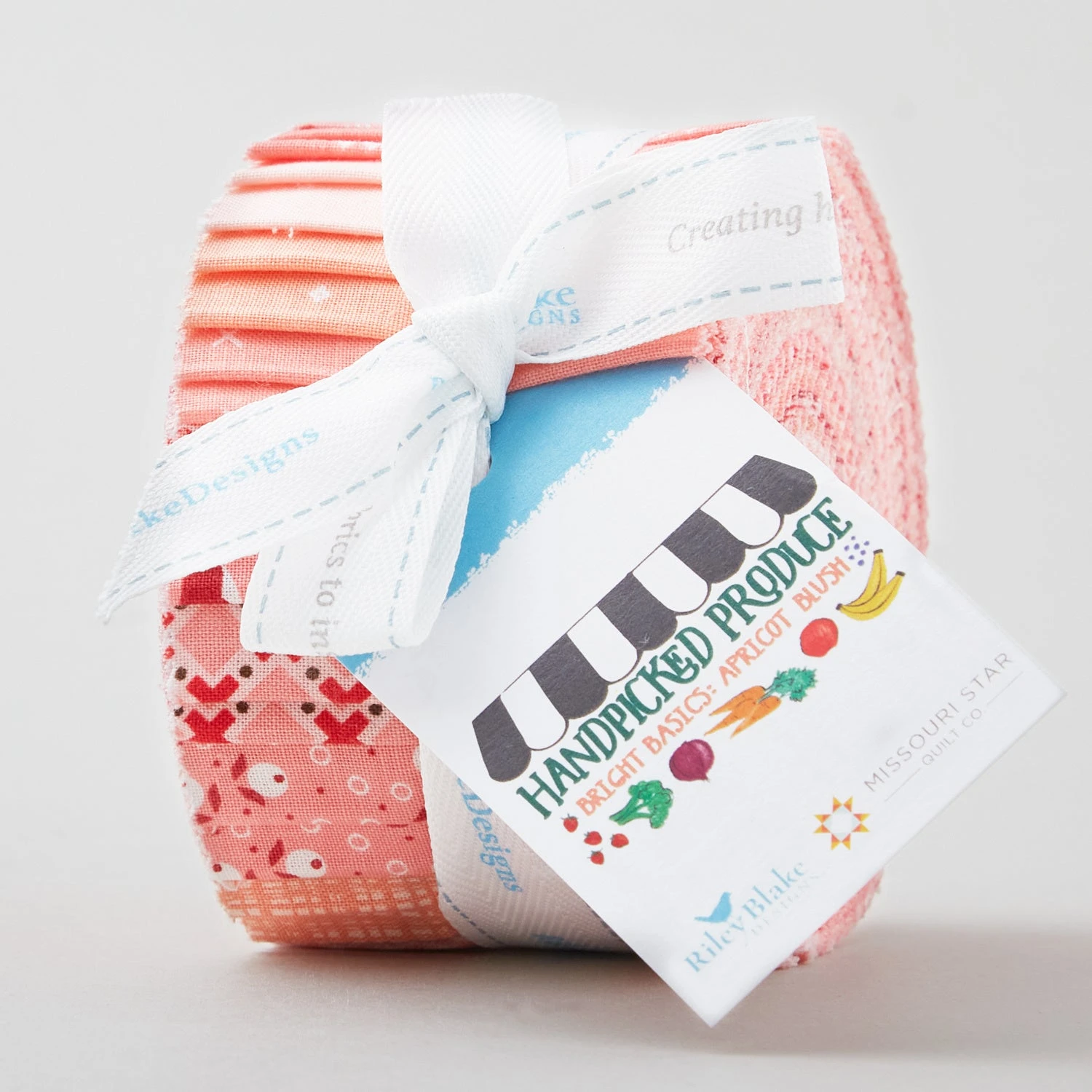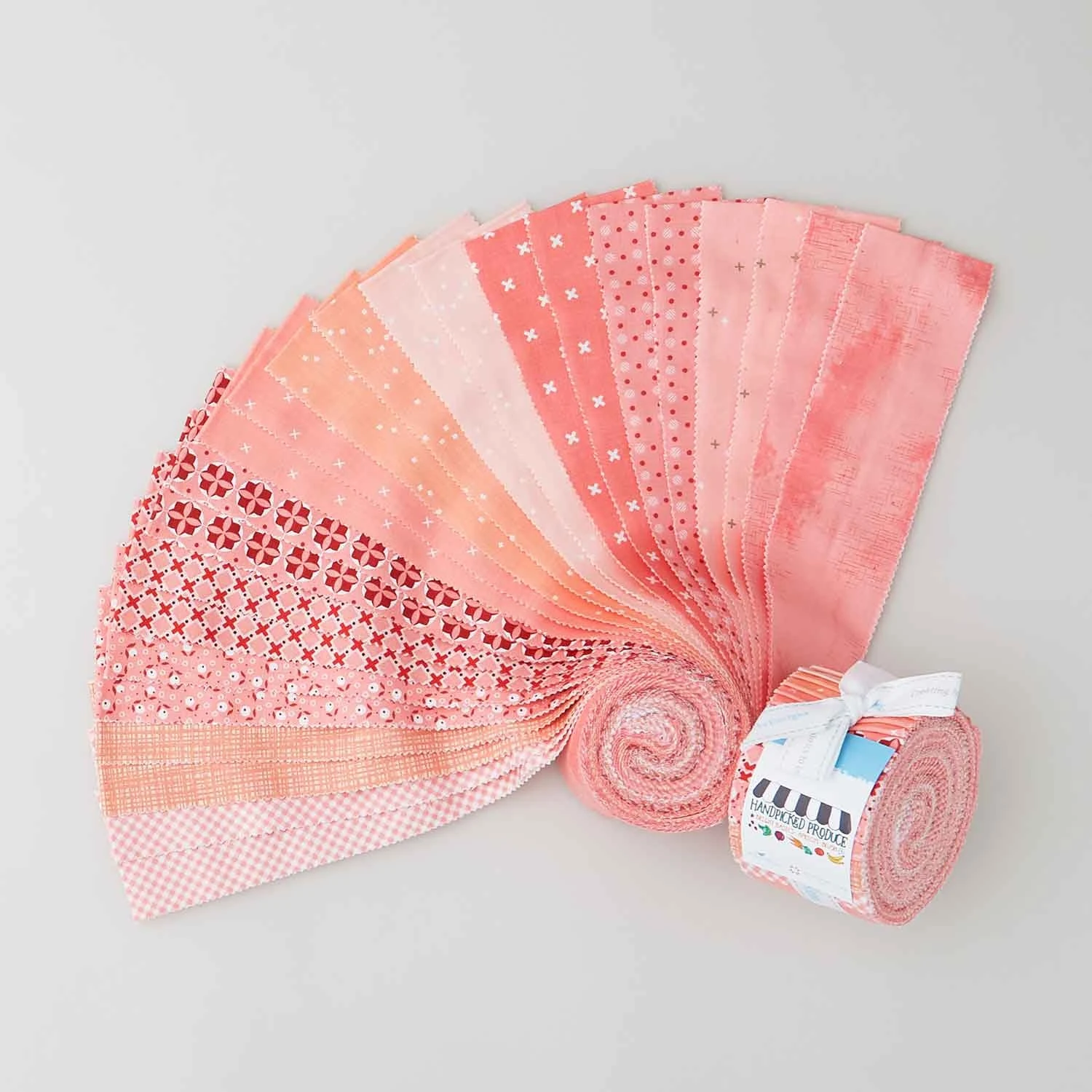 Jelly roll of 2 1/2” strips with textured solids, dots, checks, and other small prints in shades of apricot. Browsing through the Handpicked Produce collection from Riley Blake is like strolling through a farmers market! You’ll see fresh greens and juicy oranges in patterns that are pretty as a peach! From sweet solids to beautiful blossoms, you’ll find just the right ingredients for your quilted project.