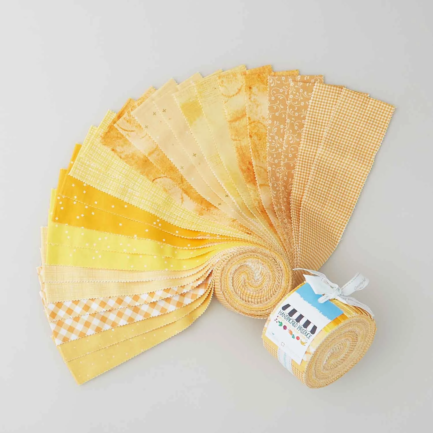 Jelly roll of 2 1/2” strips with textured solids, dots, checks, and other small prints in shades of yellow. Browsing through the Handpicked Produce collection from Riley Blake is like strolling through a farmers market! You’ll see fresh greens and juicy oranges in patterns that are pretty as a peach! From sweet solids to beautiful blossoms, you’ll find just the right ingredients for your quilted project.