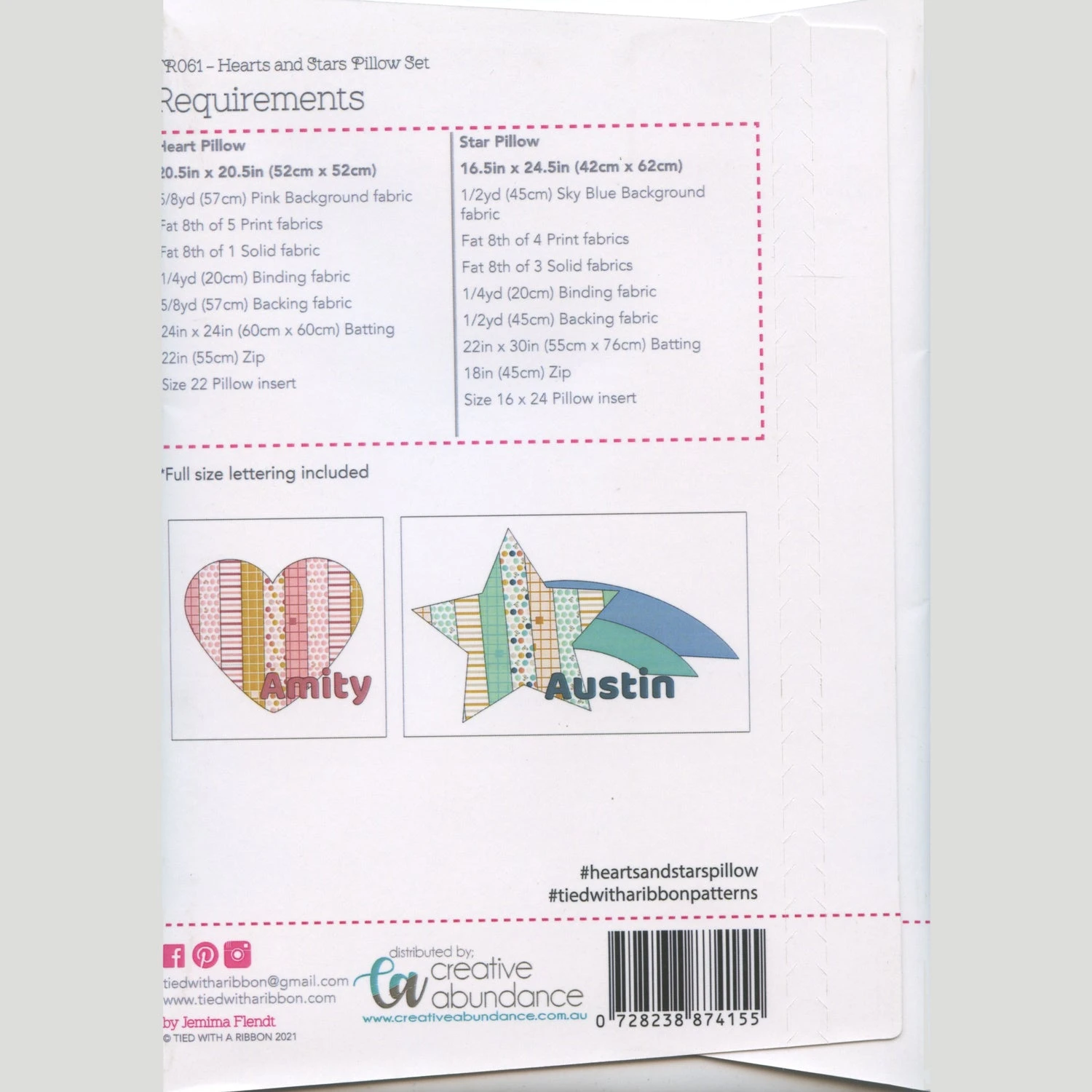 Make a personalized pillow for your favorite kiddo! The fat-eighth friendly Hearts and Stars Pillow Set pattern by Tied with a Ribbon includes applique shapes of a heart and a shooting star, full-size lettering to make any name, and clear full-color instructions with photos and illustrations. A personalized pillow makes a great gift!