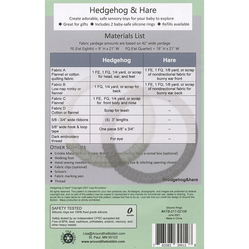 Make an adorable sensory toy for your favorite baby in a snap! The Hedgehog and Hare Patten by Around the Bobbin makes an adorable hedgehog and bunny that are full of crinkly fun, and attached to a silicone ring–perfect for teething babies! The silicone is perfectly safe for chewing, and babies get to explore different textures with the silicone ring and crinkly hedgehog and bunny. Includes 2 silicone rings, dishwasher safe, rings made from 100% baby-safe food grade silicone.