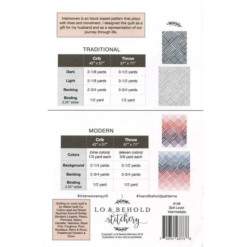 Have some fun playing with lines and movement when you make a quilt from the Interwoven pattern by Lo & Behold Stitchery. Interwoven is a block-based pattern that includes two booklets. One booklet is for crib and throw sizes; the other one is for twin, queen and king sizes. Pattern includes helpful diagrams, instructions, alternate colorway ideas and a coloring page to plan your quilt. It is suitable for intermediate-level quilters.