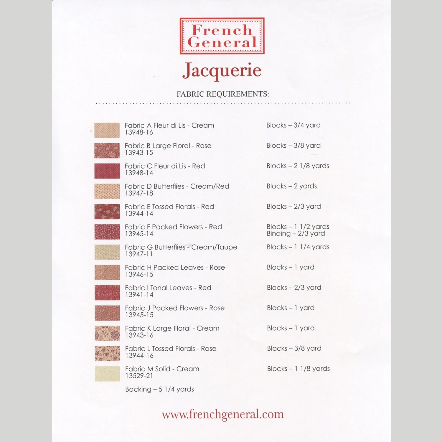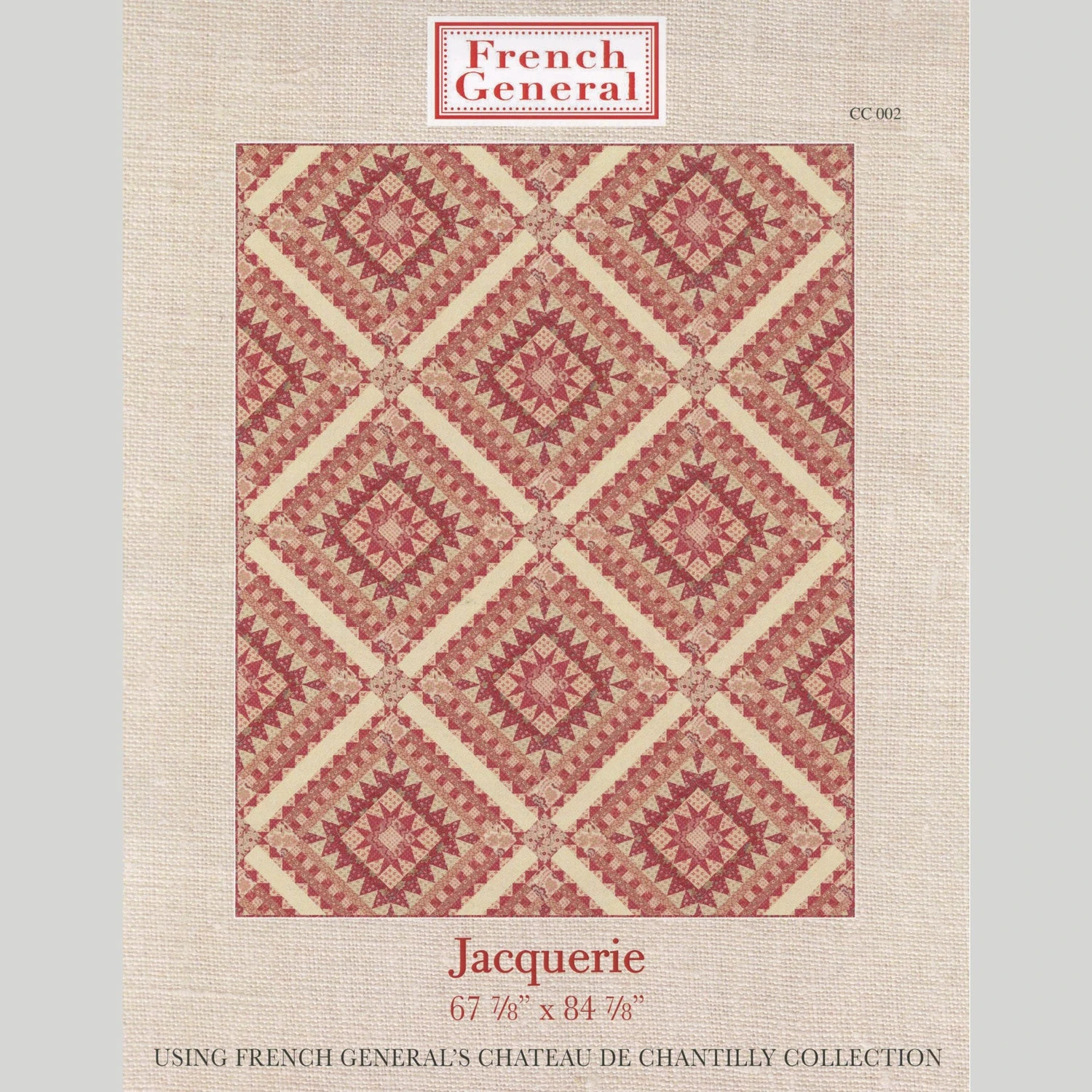 Oh-so-pretty piecing! Pattern, by Kaari Meng of French General, has piecing instructions for the quilt with a finished size of 67-7/8″ x 84-7/8″. It features French General’s Chateau de Chantilly fabric collection for Moda.