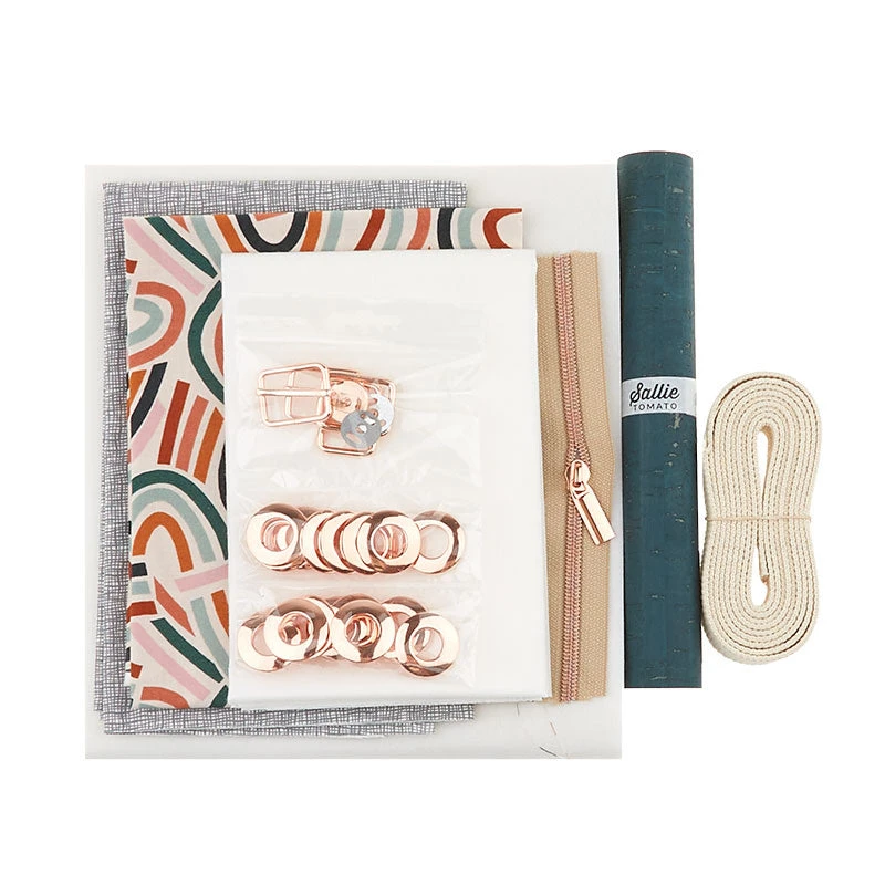 Kit includes pattern, outside fabric, rustic jasper cork, lining, interfacing, sew-in foam, natural cotton webbing, a rose gold zipper, and all the hardware needed in a rose gold finish.
