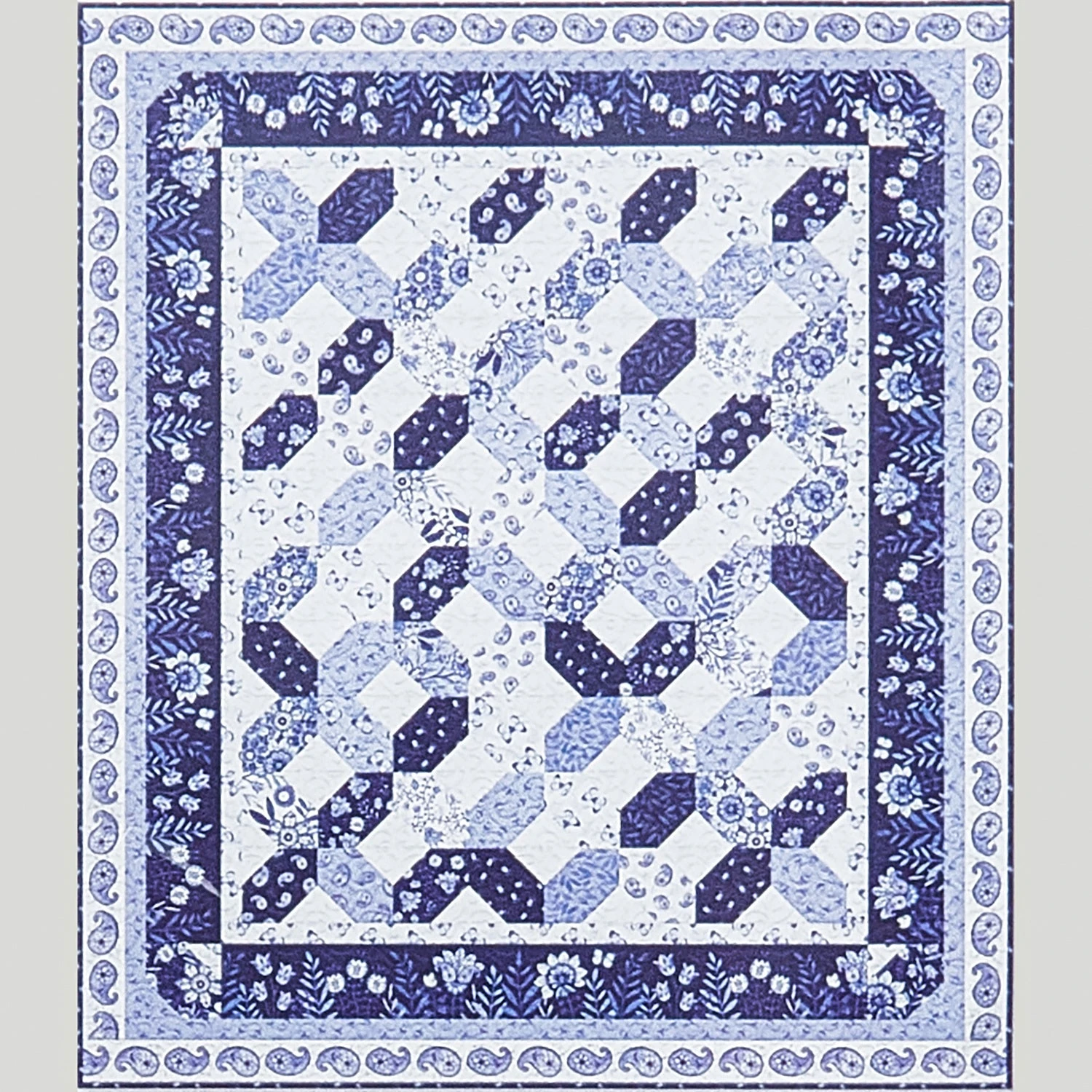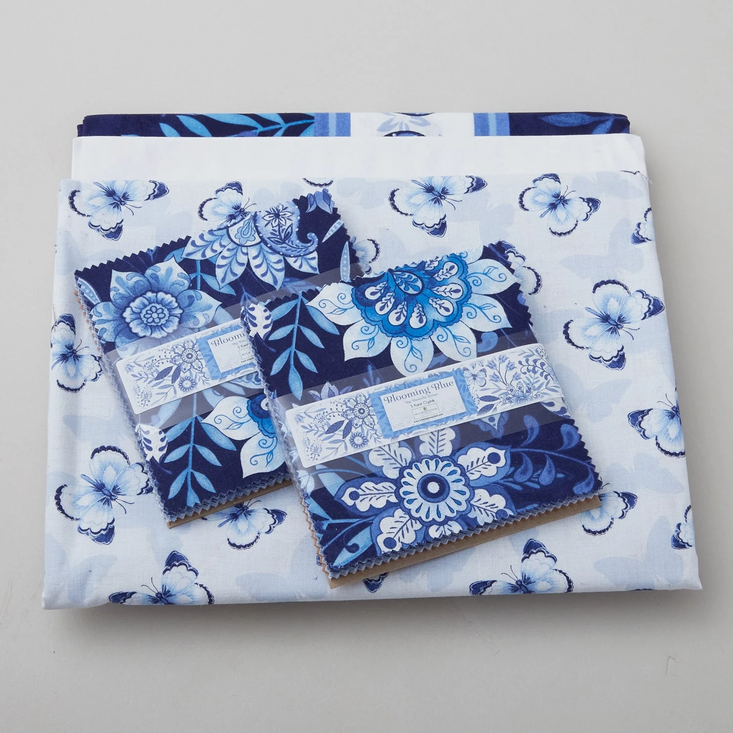 Pieced quilt kit includes instructions, Blooming Blue fabrics for top and binding by Danielle Leone for Wilmington Prints, and 5″ squares. Backing sold separately, we suggest 3 3/4 yards of Blooming Blue – Tulip Vines Navy Yardage.