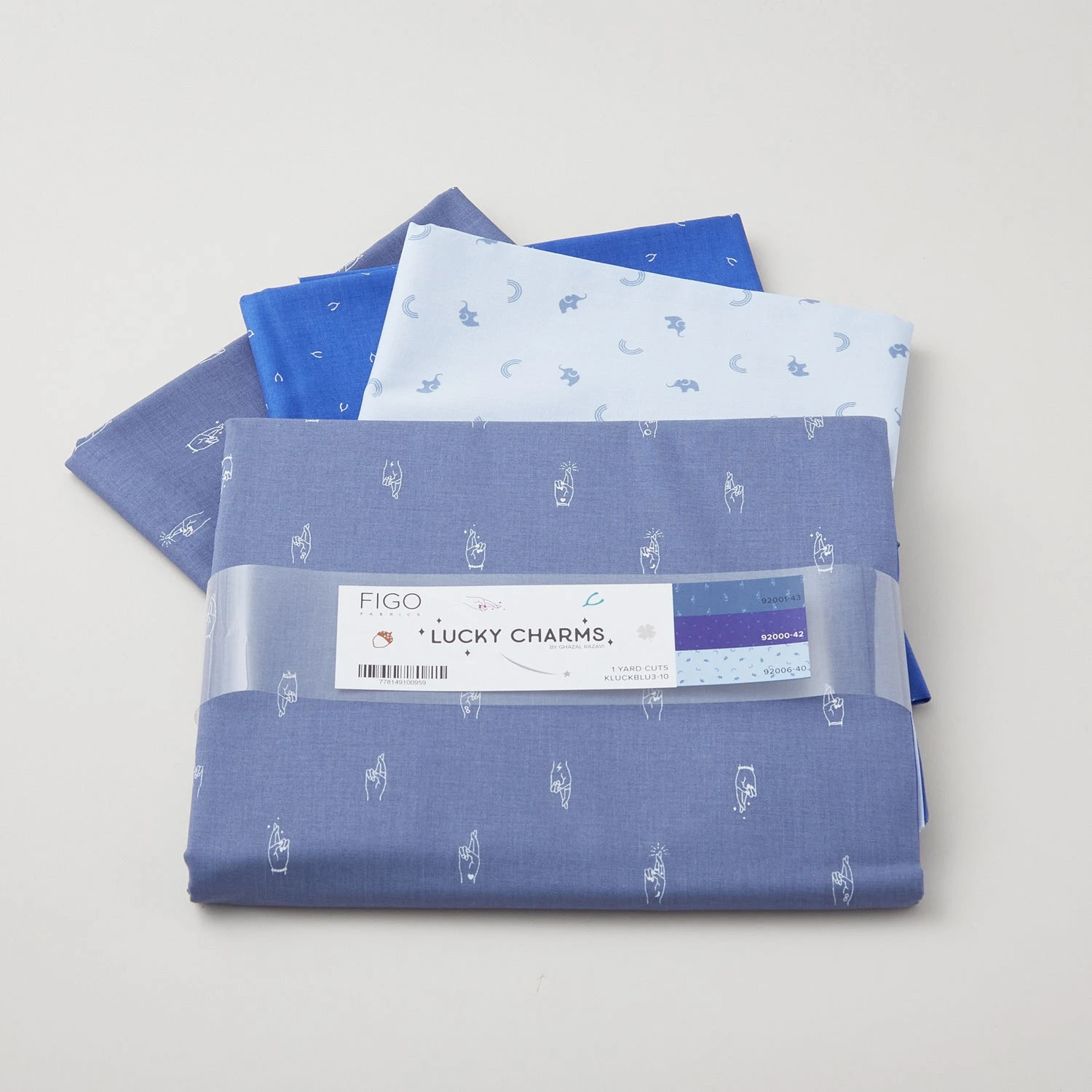An all blue one-yard-bundle of 3 fabric prints. you’ll see hand signs, tiny elephants, and wishbones. From FIGO Fabrics.