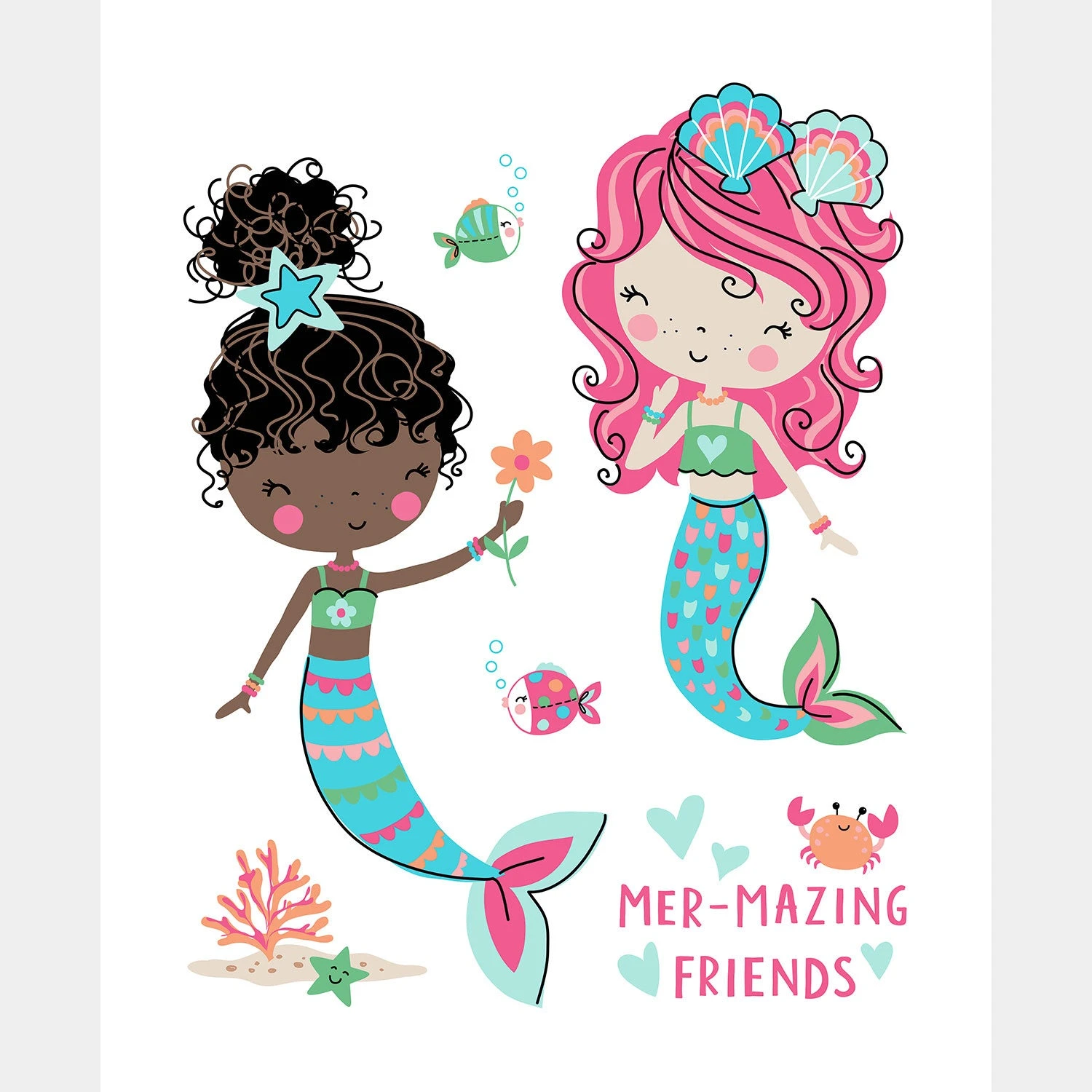 Panel featuring two mermaids and the phrase “Mer-mazing Friends” on a white background. Dive into Riley Blake’s Mer-mazing collection! Cute little mermaids and their aquatic friends want to be part of your next project. Sew some mermaids, shells, bubbles, scales, and sea life into a quilt for any mermaid fan. Wat-er you waiting for?