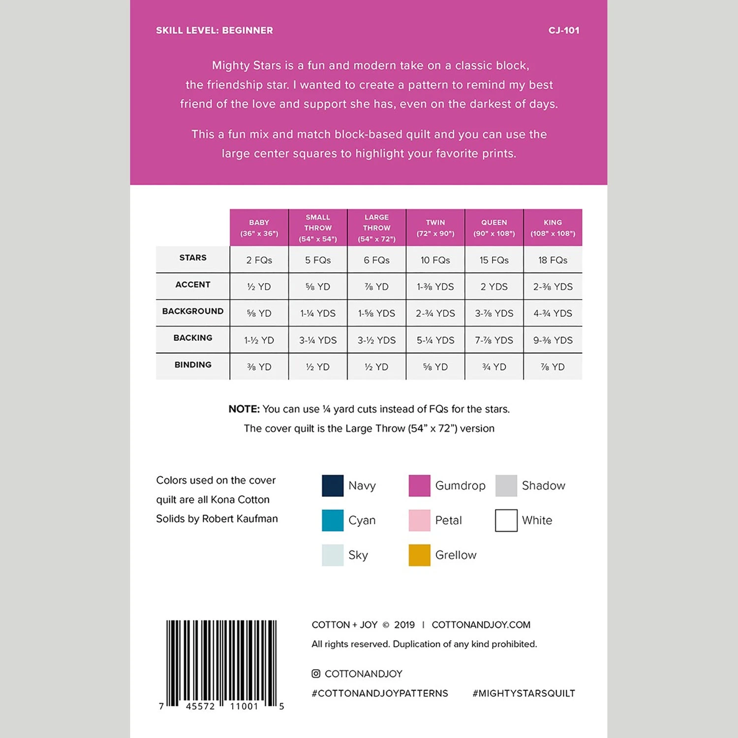 The Mighty Stars quilt pattern from Cotton and Joy is a fun and modern take on a classic block, the friendship star. It is a mix-and-match block-based quilt that has minimal waste. You can use the large center squares to highlight your favorite prints! Pattern includes helpful diagrams, detailed instructions, and alternate colorways to help you decide your fabric choices. The throw-size quilt pictured on the cover was made with Kona Cotton Solids by Robert Kaufman.