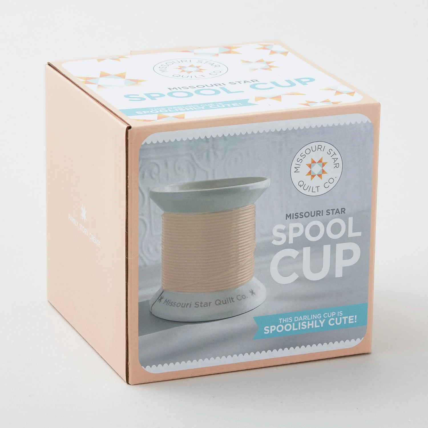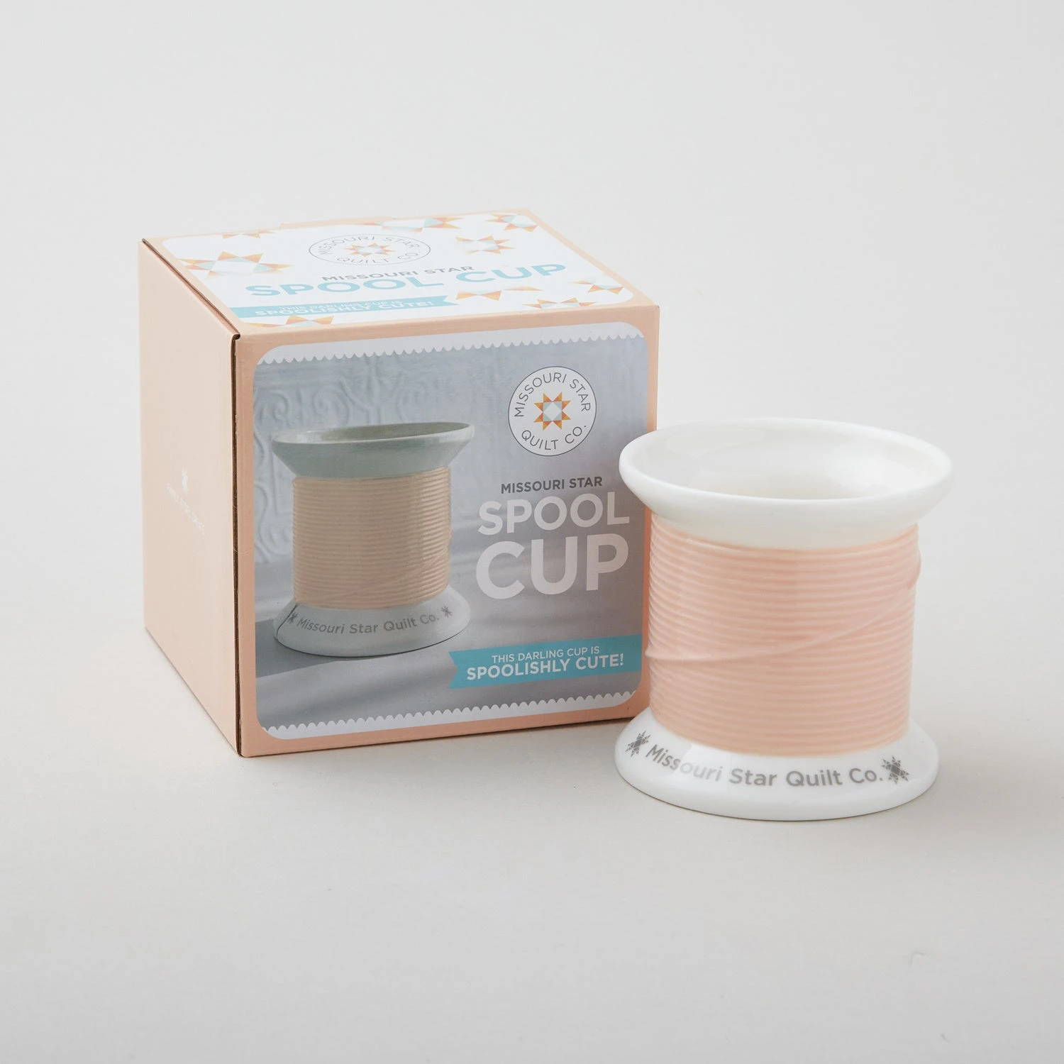 This darling cup is spoolishly cute! Made from porcelain with a white matte finish and peach thread, it features the Missouri Star Quilt Co. logo on the spool rim. It’s perfect as a pencil cup, notions holder, sewing room organizer, or even a little vase.