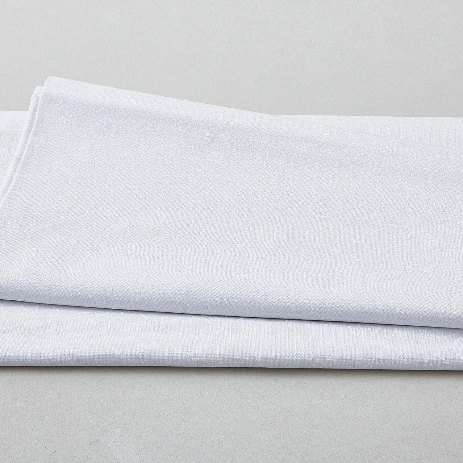 A 3-yard cut of white dots forming flowers and swirls on a white background. Find the perfect white-on-white fabrics in Morning Mist by Blank Quilting Co. This lovely collection gives you a variety of prints to choose from: florals, snowflakes, hearts, and much more on all white backgrounds!