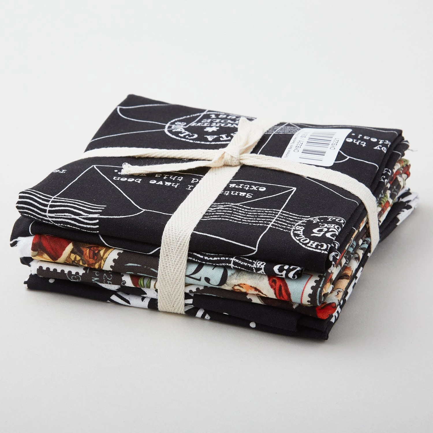 A one-yard-bundle of three black prints from the Nicholas collection. Created by 3 Dog Design for Riley Blake Designs, these Santa Claus – themed prints feature postage stamps, letters, to St. Nicholas, and more.