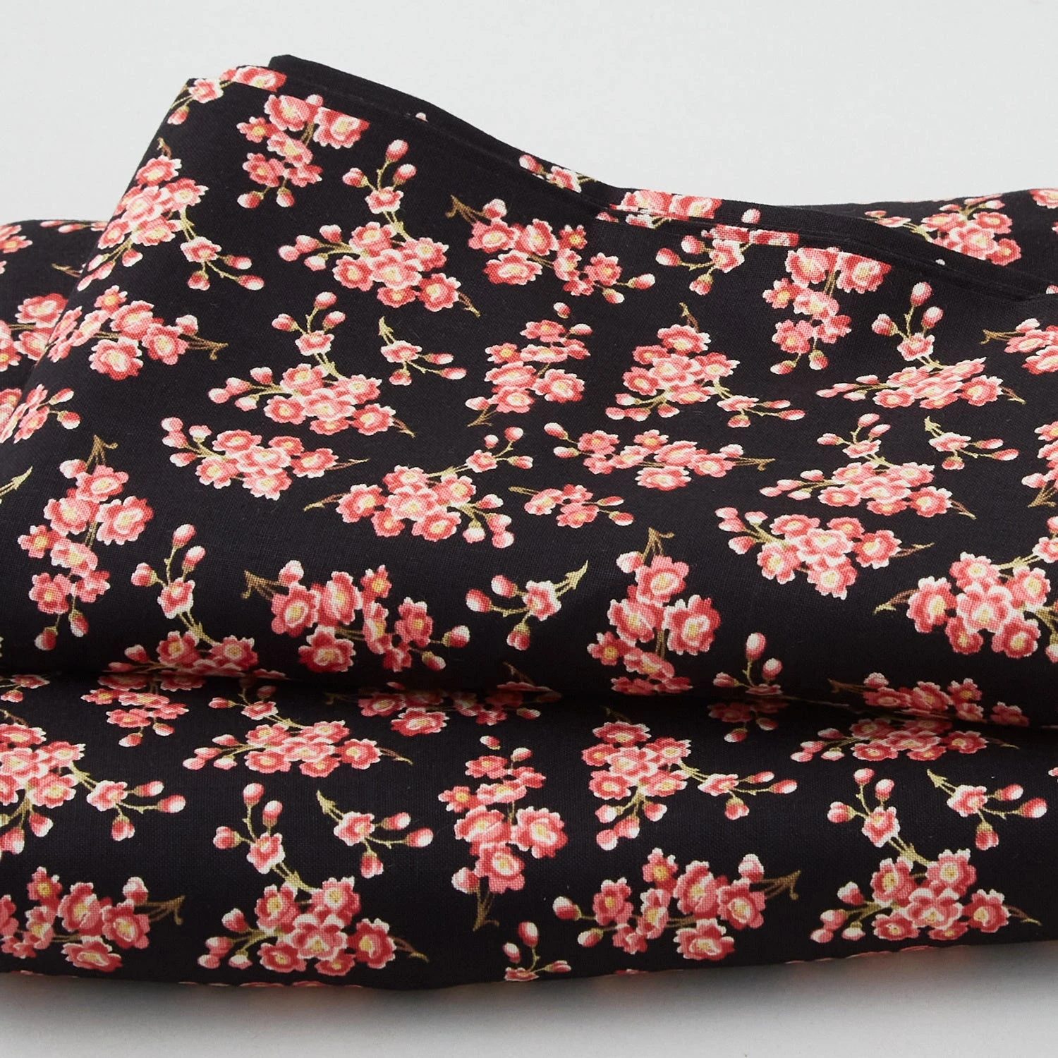 A 3-yard cut of pink rosettes clustered on a black background. Designed by Kaye England, Pathways is a timeless fabric collection in lovely golden tan, rosy pink and “breen,” with cream and black accents featuring elegant florals.