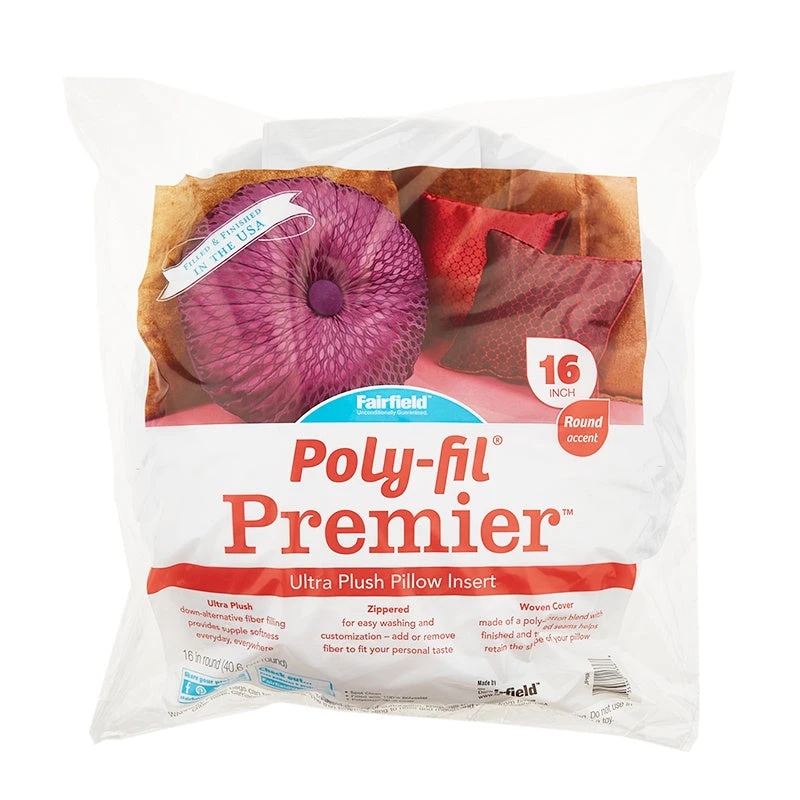 Fulfill your accent pillow-making needs with this round pillow form! Measuring 16″ in diameter, this pillow form from Poly-Fil is filled with polyester fiber fill and has a cotton/polyester high quality cover. Super soft too!
