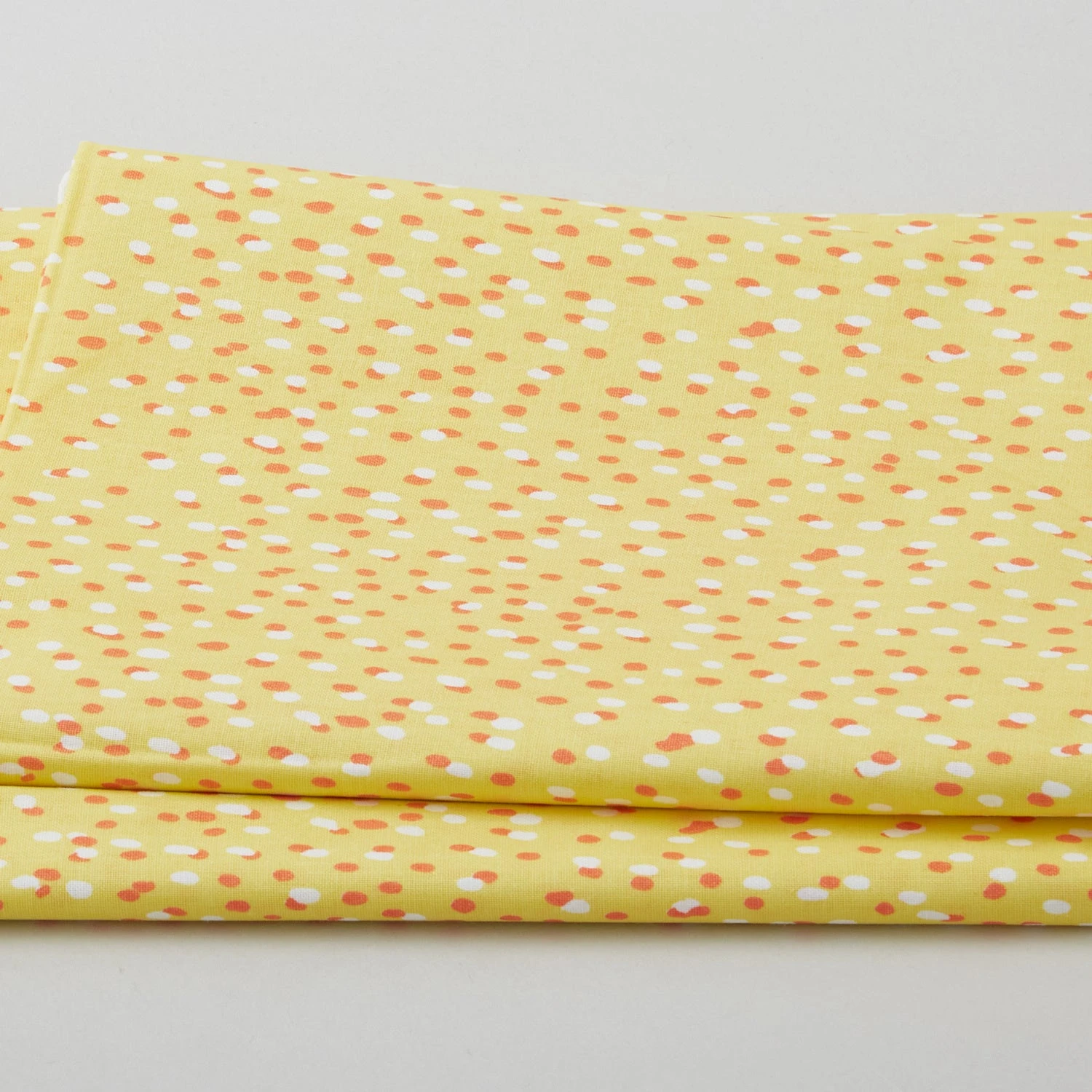 A 2-yard cut of white and orange dots on a yellow background. Variety is the spice of life, and these 2-yard cotton cuts from Fabric Editions offer plenty of it! Prints such as pink flamingos and scattered hearts add a fun touch to any project, and the solids are great staples for your stash.