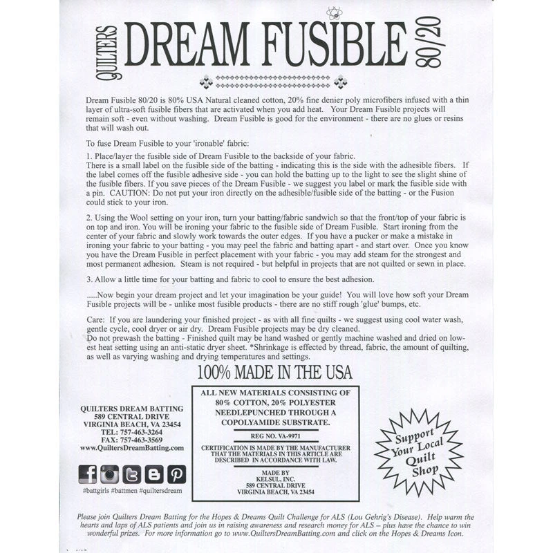 Quilter’s Dream Fusion is an 80/20 cotton and poly blend that is “infused” with soft fusible fibers, eliminating the need for pinning and basting. Solvent-free, may be machine washed and dried, or dry cleaned. Stitch up to 8″ apart.