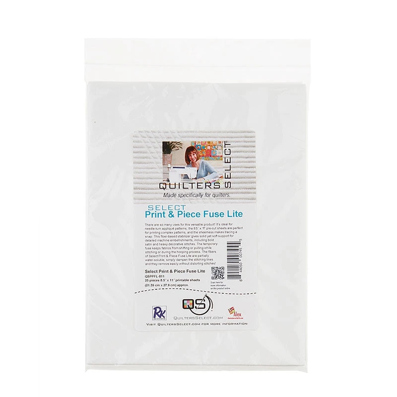 These Quilters Select Print and Piece Fuse Lite Sheets are ideal for needle-turn appliqué patterns, and the sheerness makes tracing a snap. The 8 1/2″ x 11″ pre-cut sheets are perfect for printing complex patterns with an inkjet printer. This fiber-based stabilizer gives solid yet soft support for detailed machine embellishments, including bold satin and heavy decorative stitches. The temporary fuse keeps fabrics from shifting or pulling while stitching or during the hooping process. The fibers of Select Print & Piece Fuse Lite are partially water-soluble; simply dampen the stitching lines and they remove easily without distorting stitches!