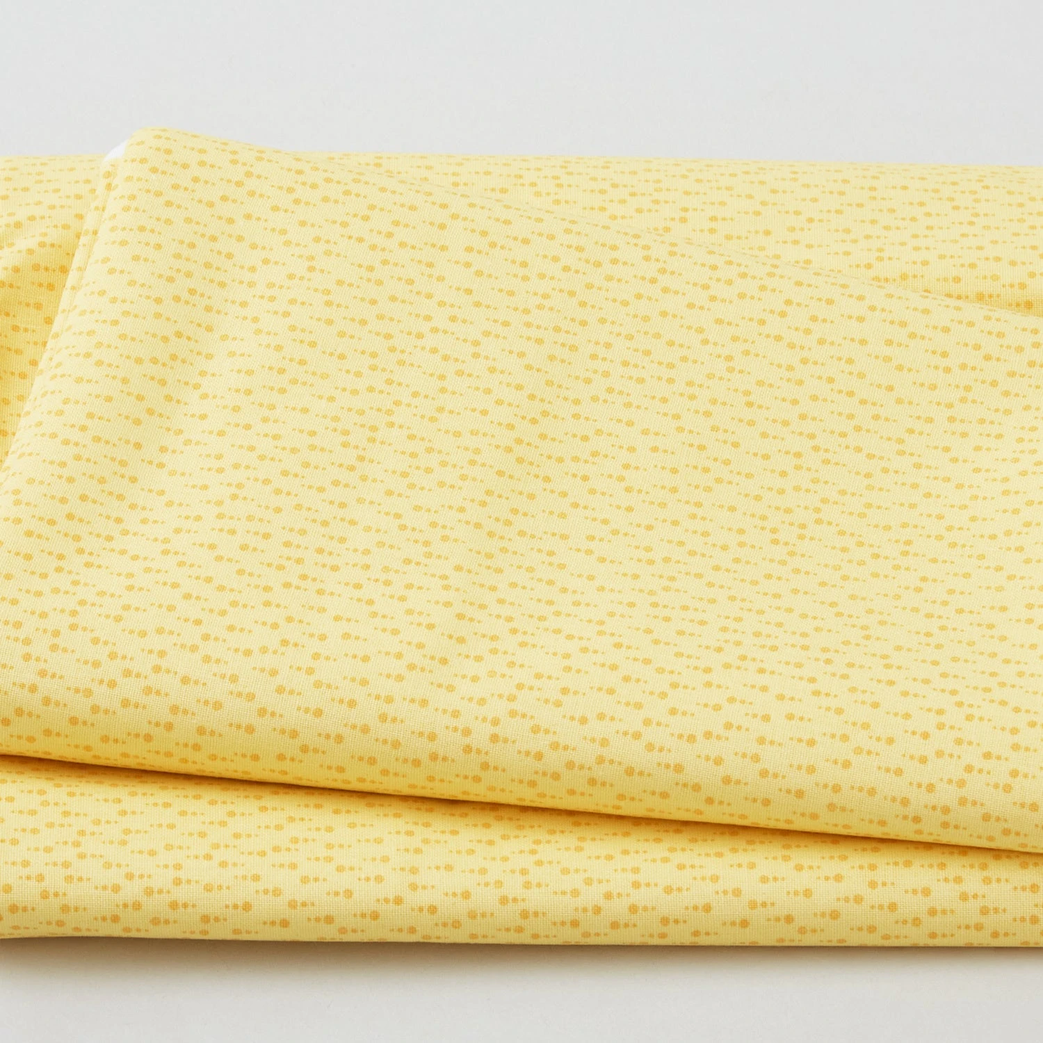 A 3-yard cut of dark yellow dots in rows on a yellow background. It’s raining cats and dots! Rows and rows of dots in a rainbow of colors line the Raindrops collection from Blank Quilting Corp. These raindrop prints are bright and sunny and right as rain!